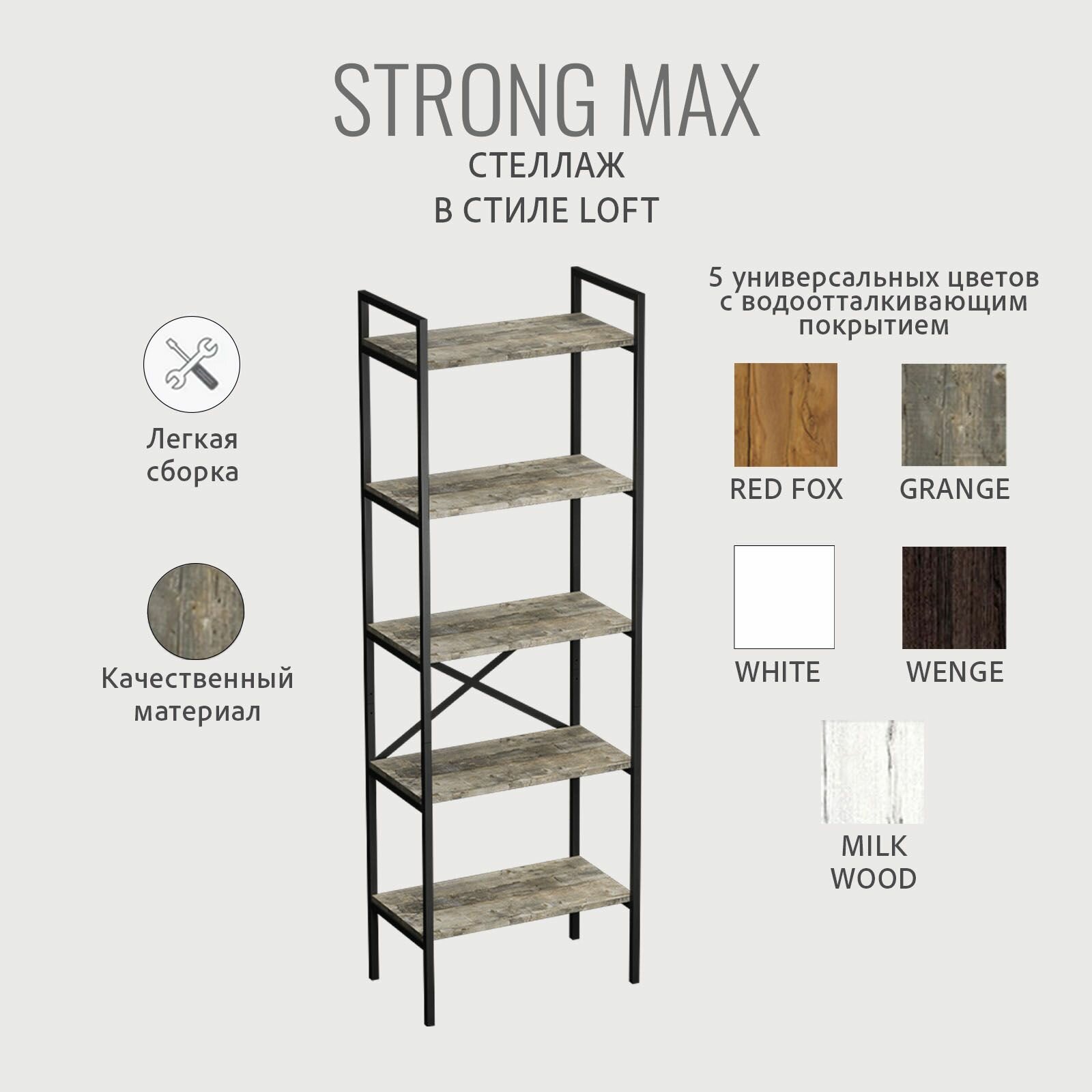Стеллаж STRONG MAX loft, коричневый, металлический напольный с 5 деревянными полками из ЛДСП, 60.5х35х181 см, гростат информация: