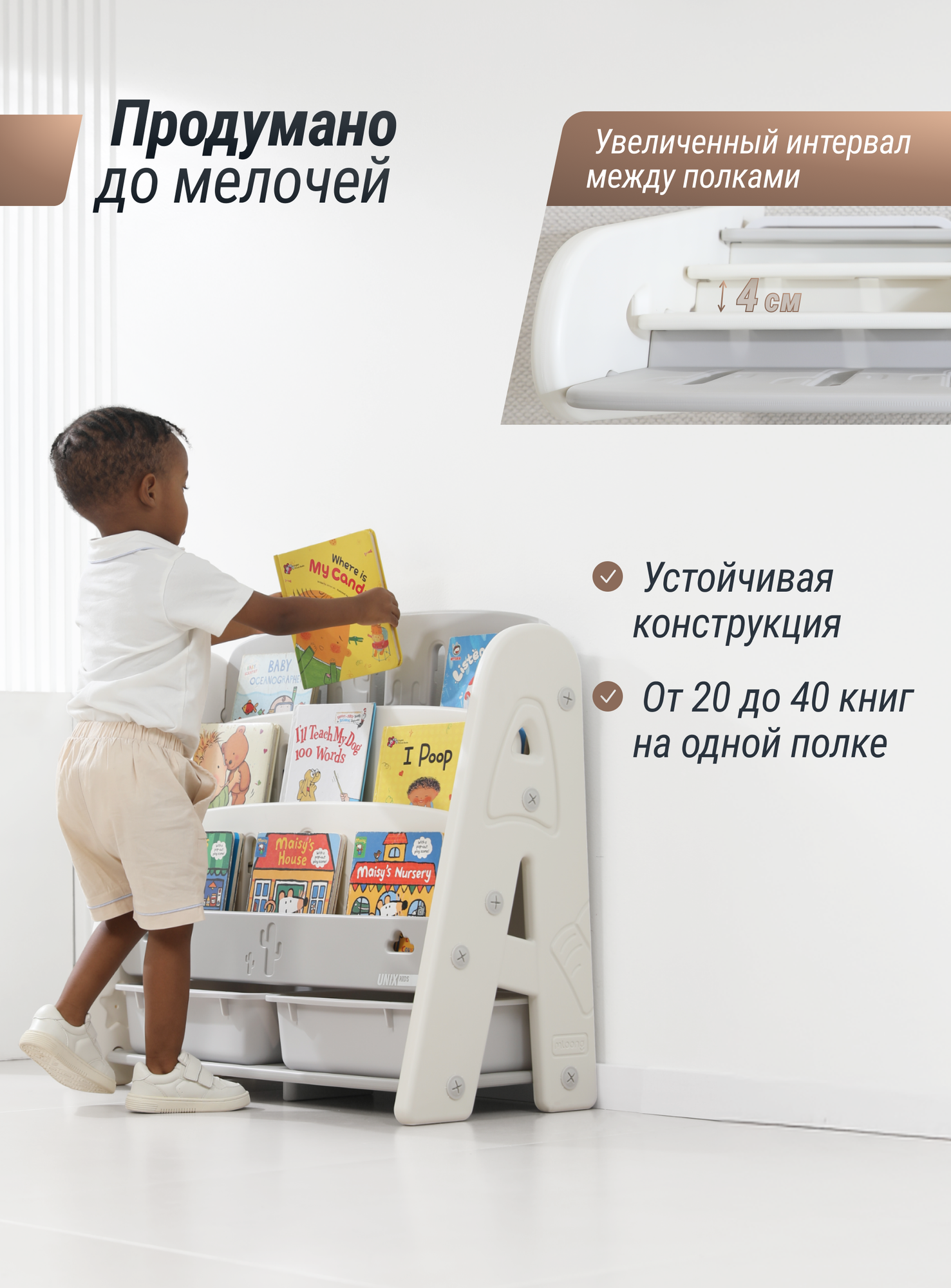 Отзывы на Детский напольный стеллаж для книг и игрушек UNIX Kids Сactus Grey подставка для учебников и журналов