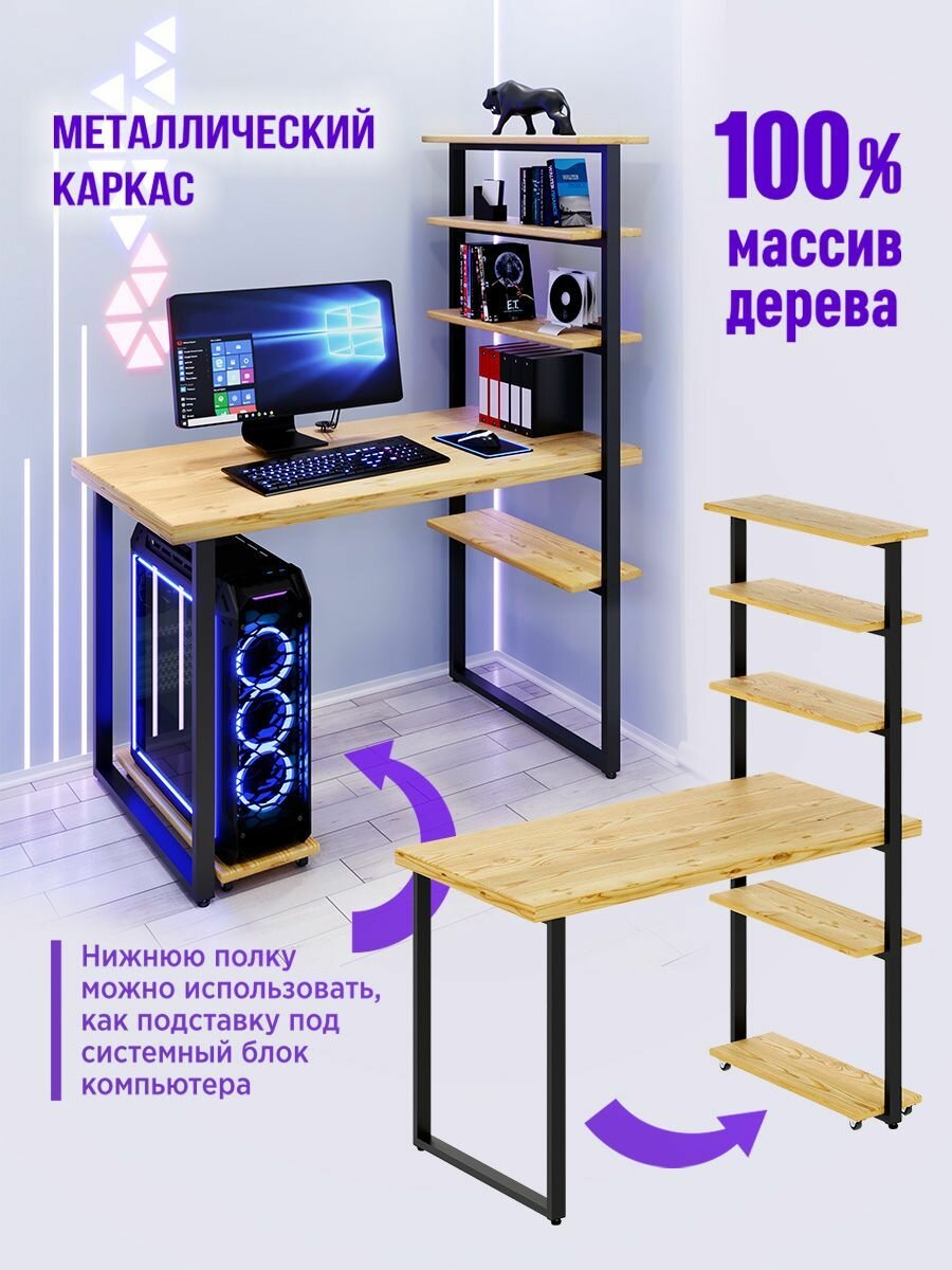 Стол компьютерный Loft с пятью полками, лакированная столешница из массива сосны 40 мм и черные металлические ножки, 130х80х148 см информация: