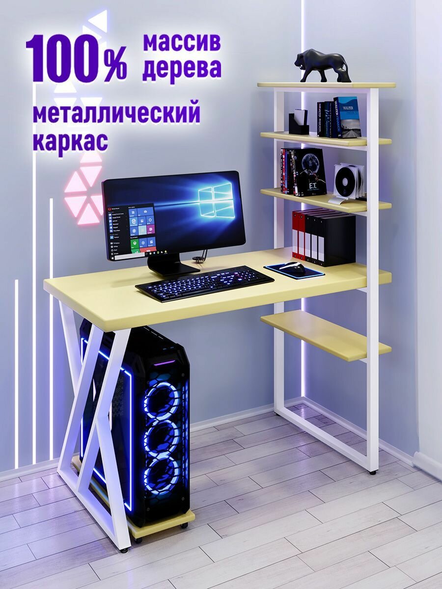 Стол компьютерный Loft с пятью полками, столешница цвета ванили из массива сосны 40 мм и белые металлические Z-образные ножки, 110х80х148 см 21 524 ₽
