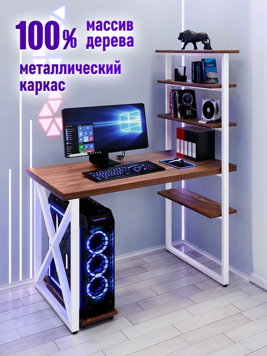 Стол компьютерный Loft с пятью полками, столешница цвета темного дуба из массива сосны 40 мм и белые металлические крестообразные ножки, 100х80х148 см информация:
