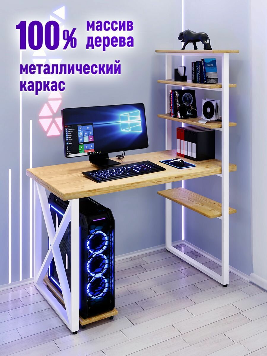 Стол компьютерный Loft с пятью полками, лакированная столешница из массива сосны 40 мм и белые металлические крестообразные ножки, 100х80х148 см 26 846 ₽