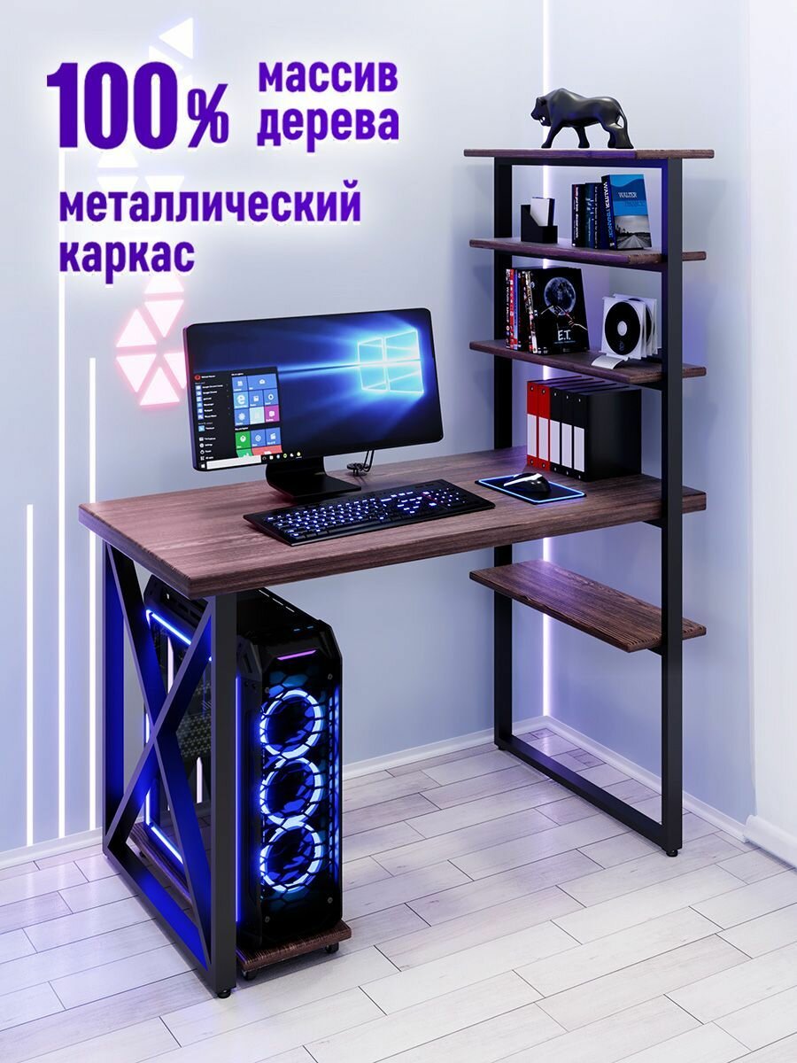 Стол компьютерный Loft с пятью полками, столешница цвета темного дуба из массива сосны 40 мм и черные металлические крестообразные ножки, 100х60х148 см 28 334 ₽
