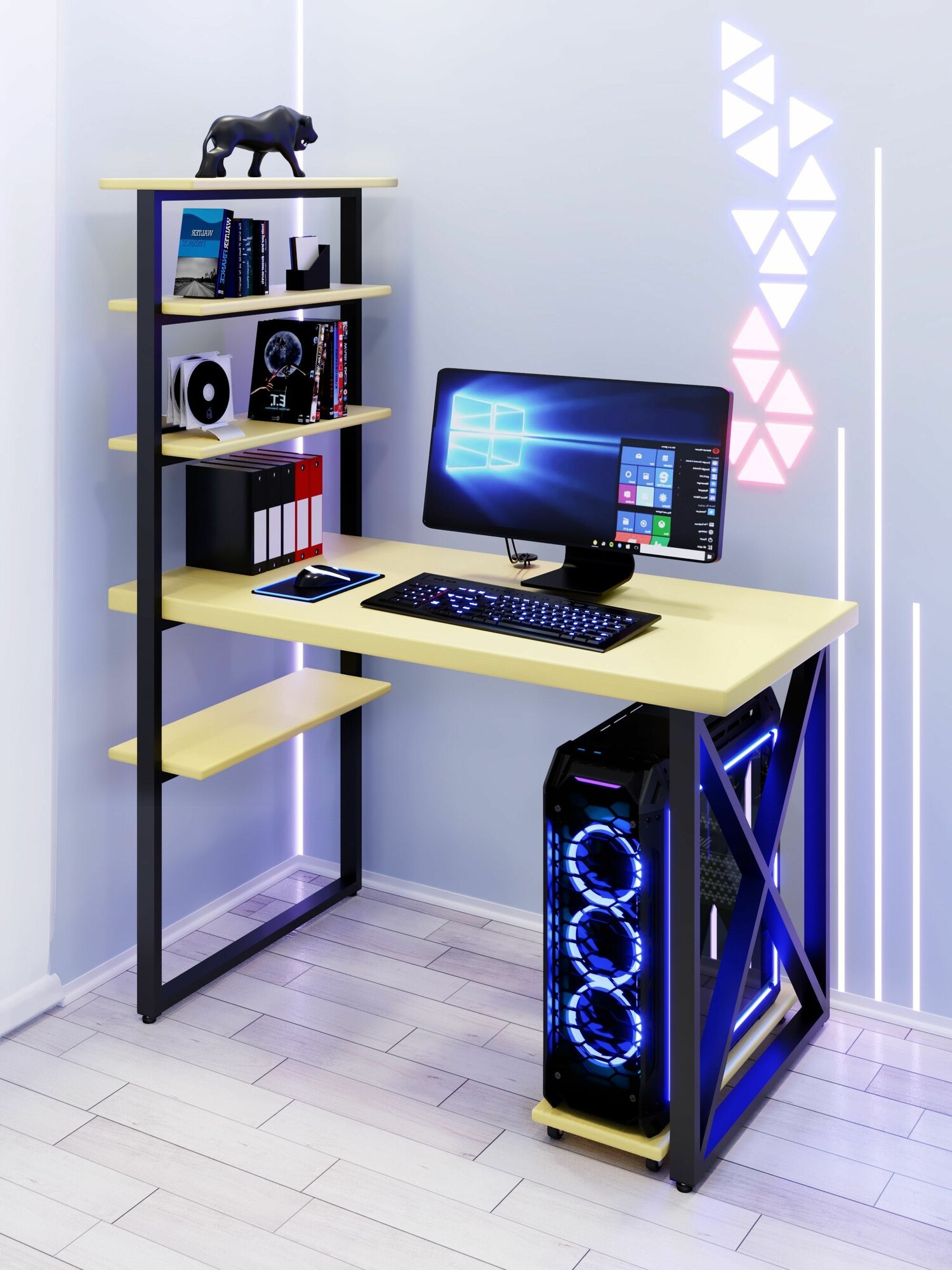 Стол компьютерный Loft с пятью полками, столешница цвета ванили из массива сосны 40 мм и черные металлические крестообразные ножки, 100х60х148 см 28 334 ₽
