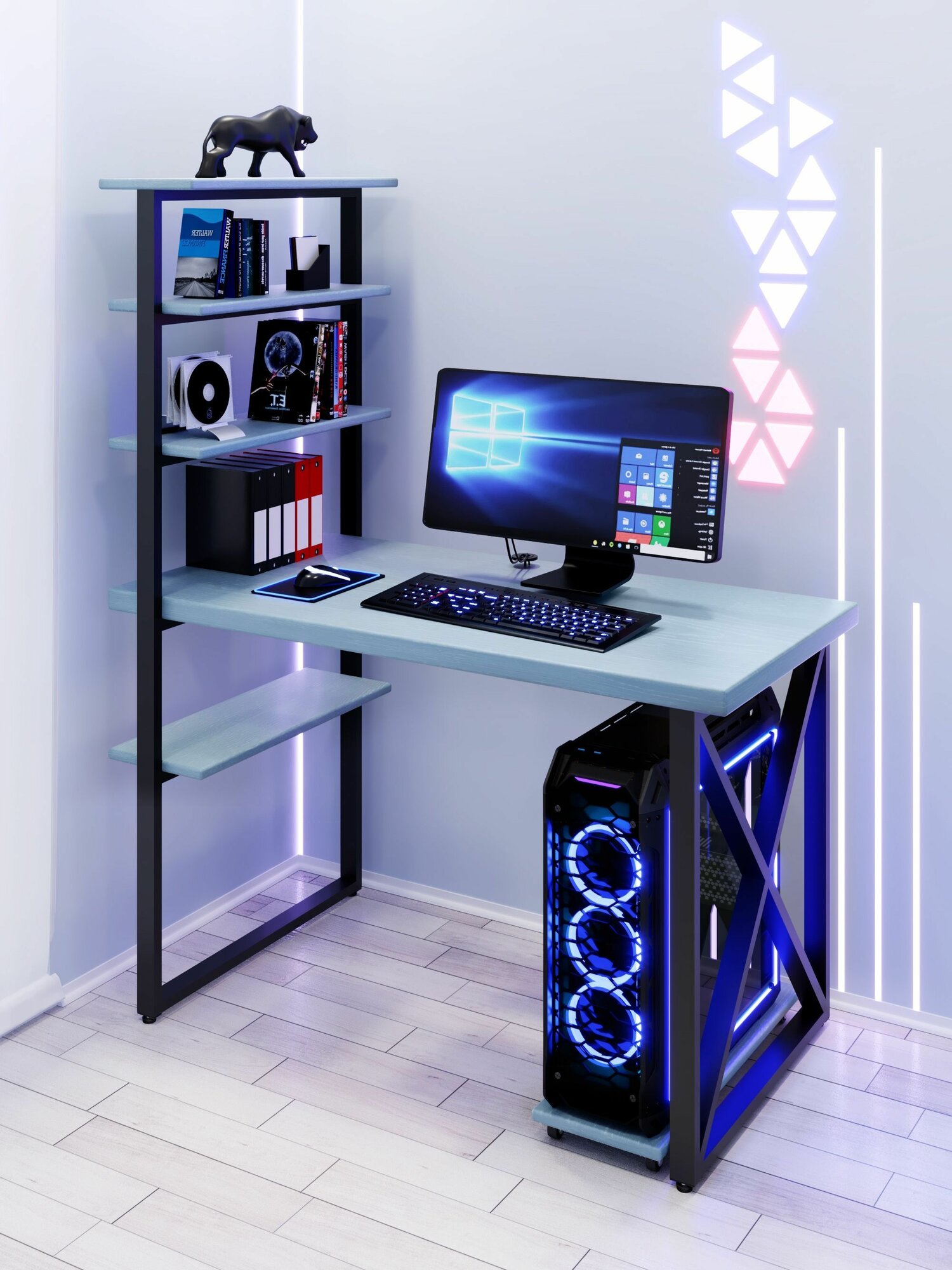 Стол компьютерный Loft с пятью полками, столешница голубого цвета из массива сосны 40 мм и черные металлические крестообразные ножки, 90х60х148 см информация: