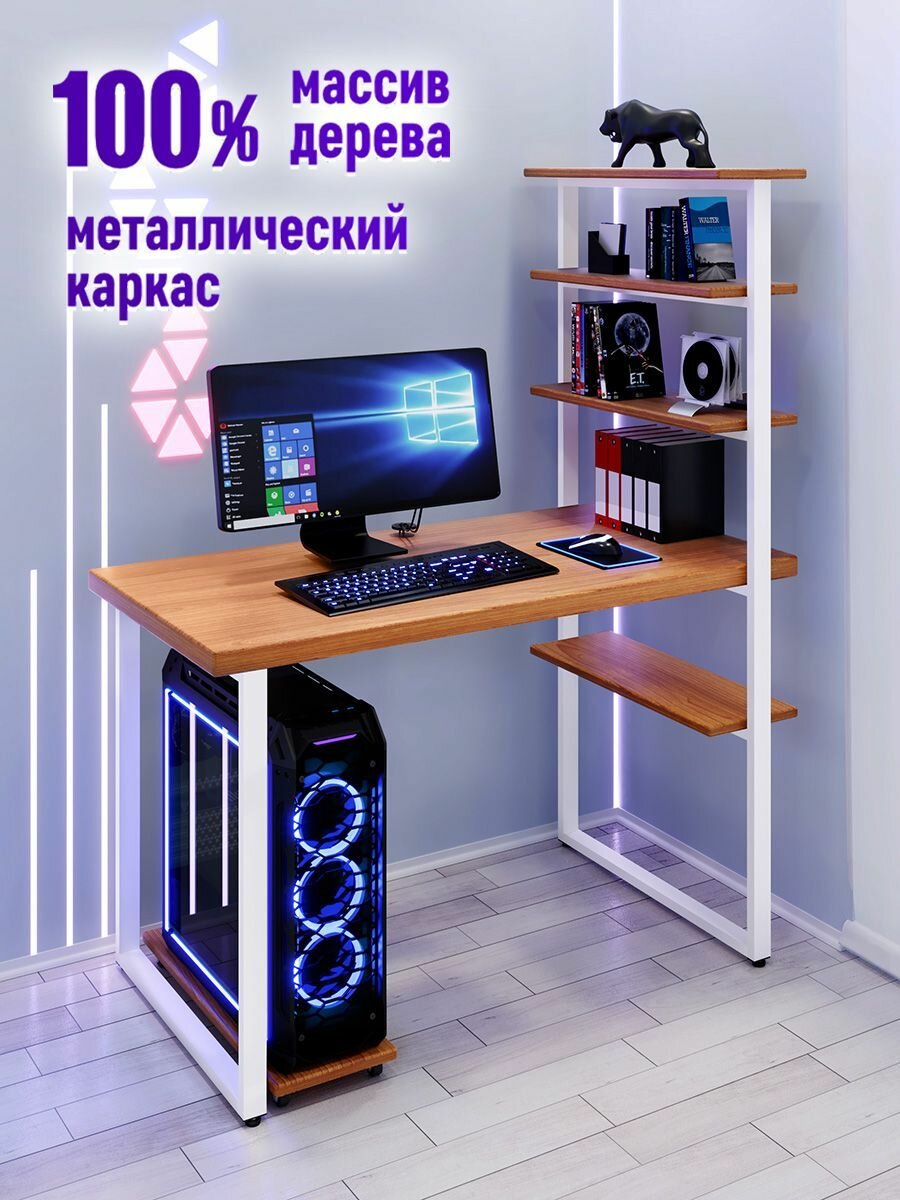 Стол компьютерный Loft с пятью полками, столешница цвета ольхи из массива сосны 40 мм и белые металлические ножки, 100х80х148 см 25 200 ₽