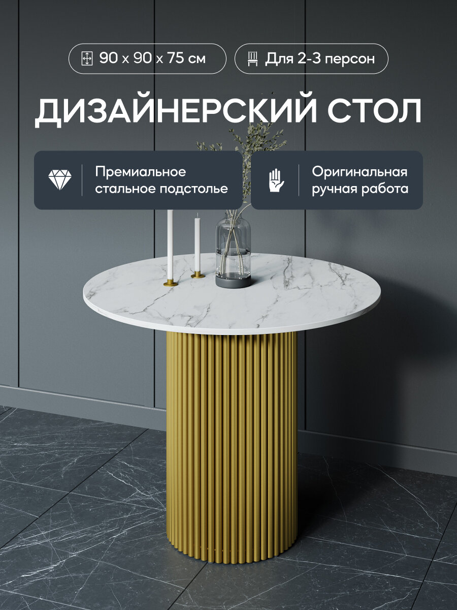 GEN GROUP Кухонный обеденный стол TRUBIS Wood L D90 см белый мрамор с золотым подстольем информация:
