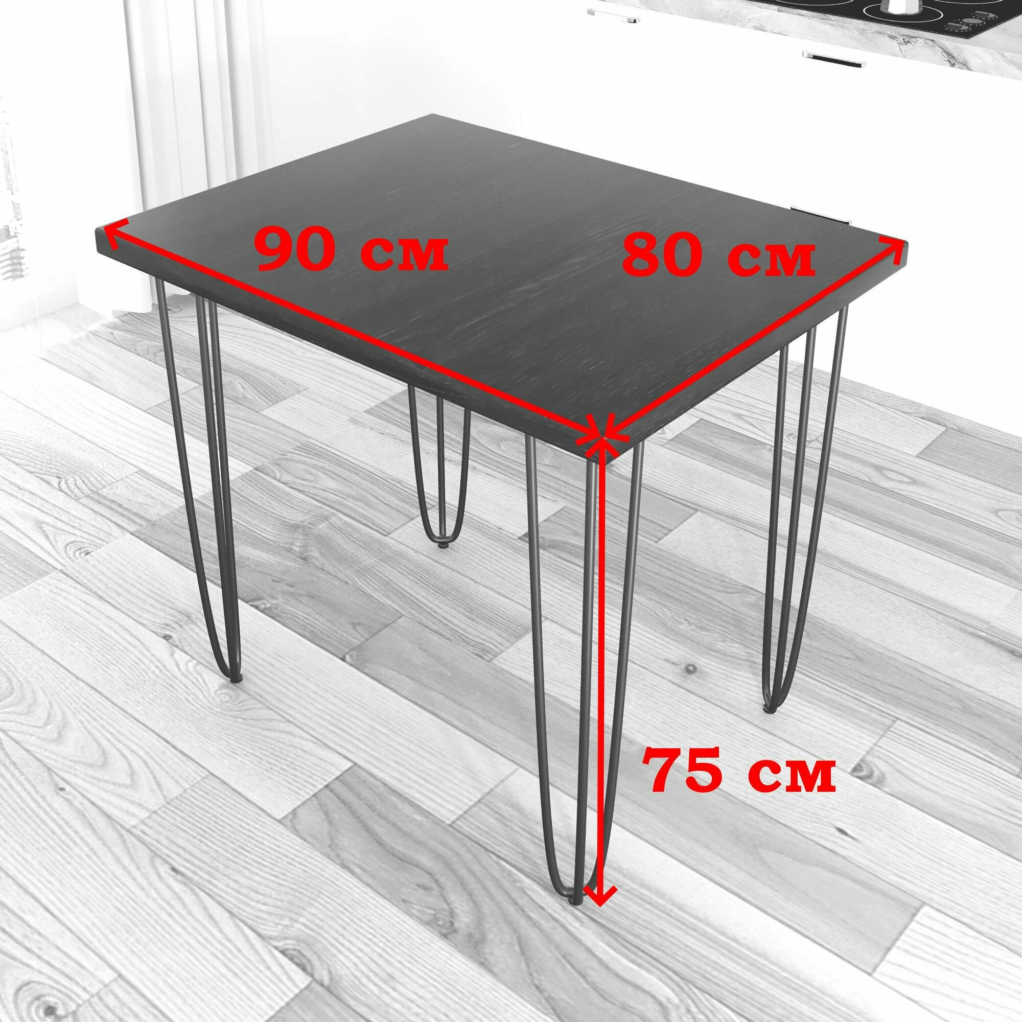 Стол кухонный Loft с лакированной столешницей из массива сосны 40 мм и черными металлическими ножками-шпильками, 90х60 см 21 430 ₽