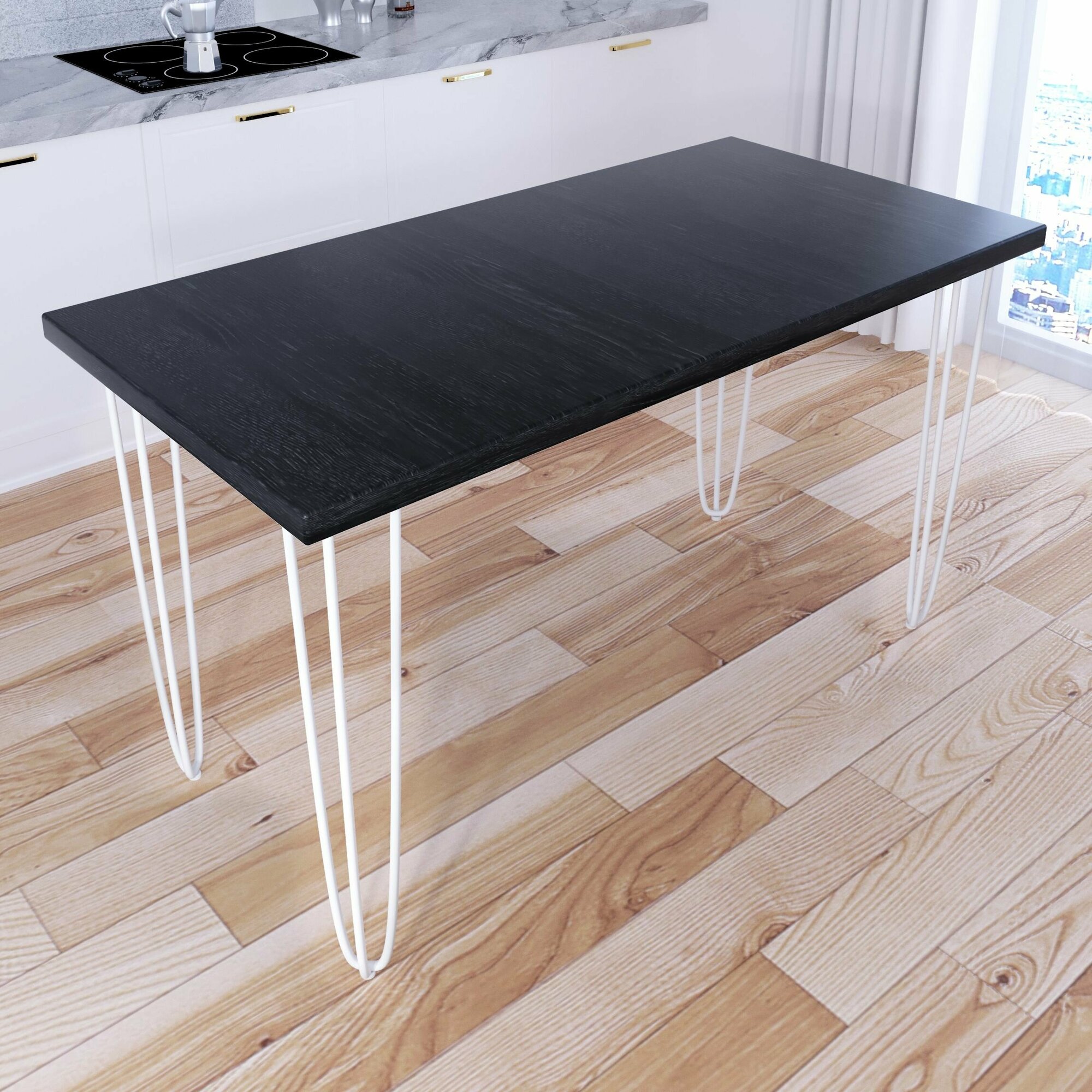 Стол кухонный Loft со столешницей белого цвета из массива сосны 40 мм и черными металлическими ножками-шпильками, 140х70х75 см