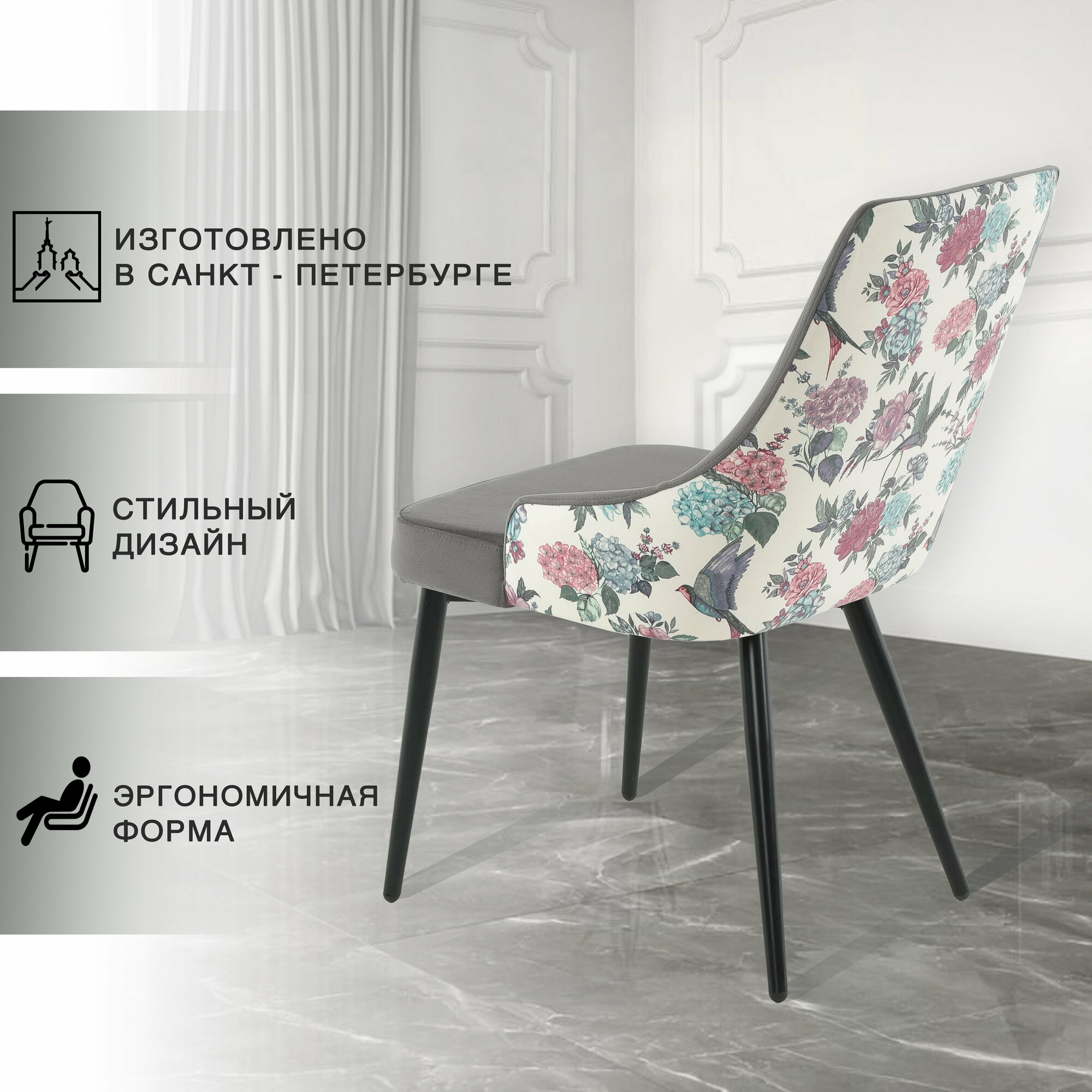 Характиристики этого товара не найдены!Отзывы на Кухонный стул с анатомической спинкой и мягким сиденьем, серый велюр с цветами
