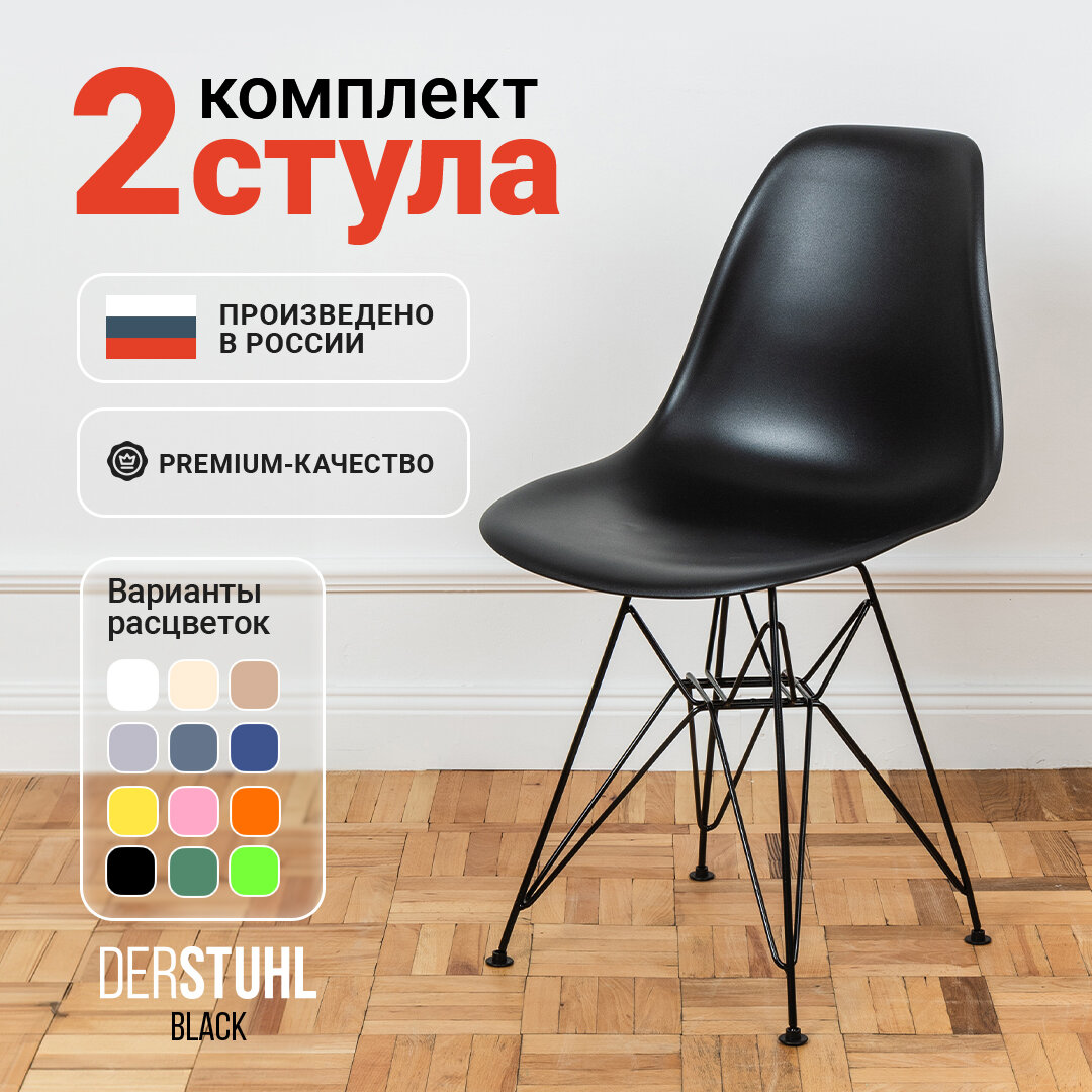 10 цен на Стулья для кухни пластиковые на металлических ножках со спинкой обеденные интерьерные Eames Эймс, 2 шт. черный