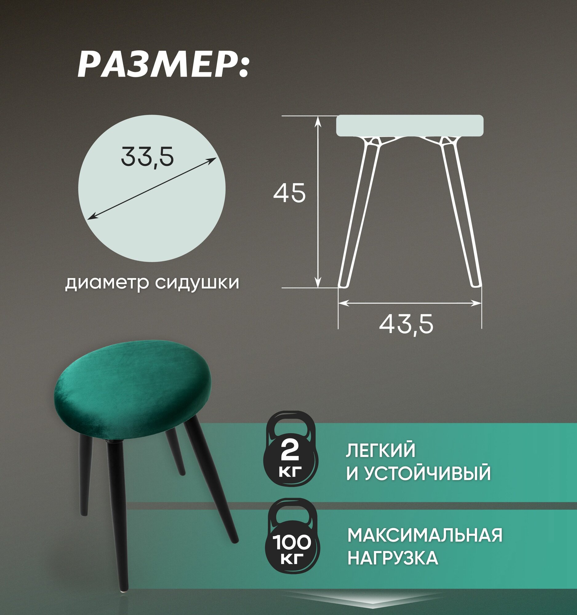 Табурет для кухни мягкий комплект 2 штуки лофт, для гостиной и дома с мягким сиденьем, зеленый вельвет, Ами Мебель информация: