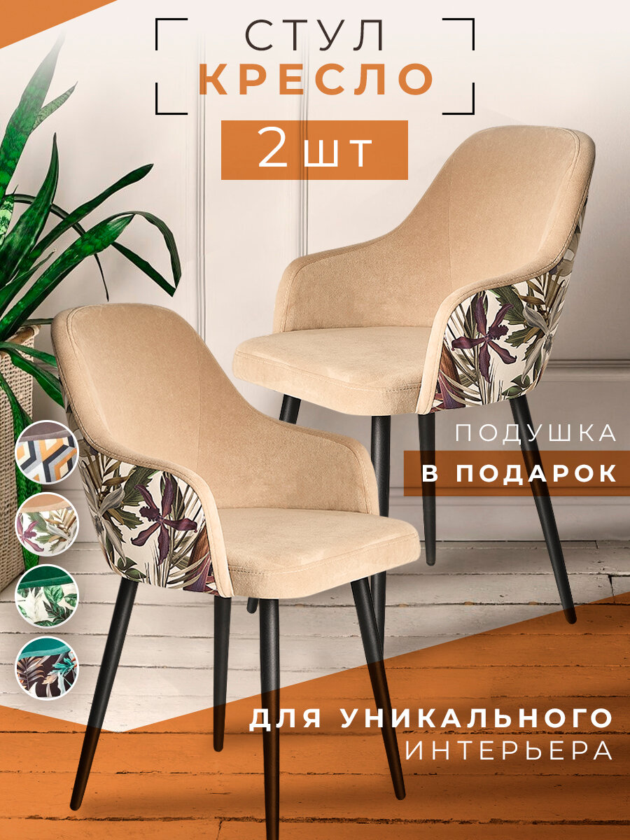 10 цен на Стул кухонный мягкий со спинкой дизайнерский велюр ERGA бежевый папоротник черные ножки 2 шт