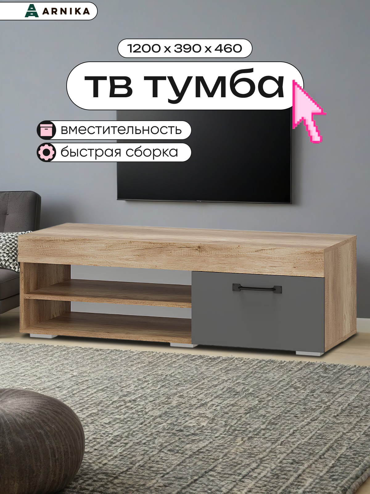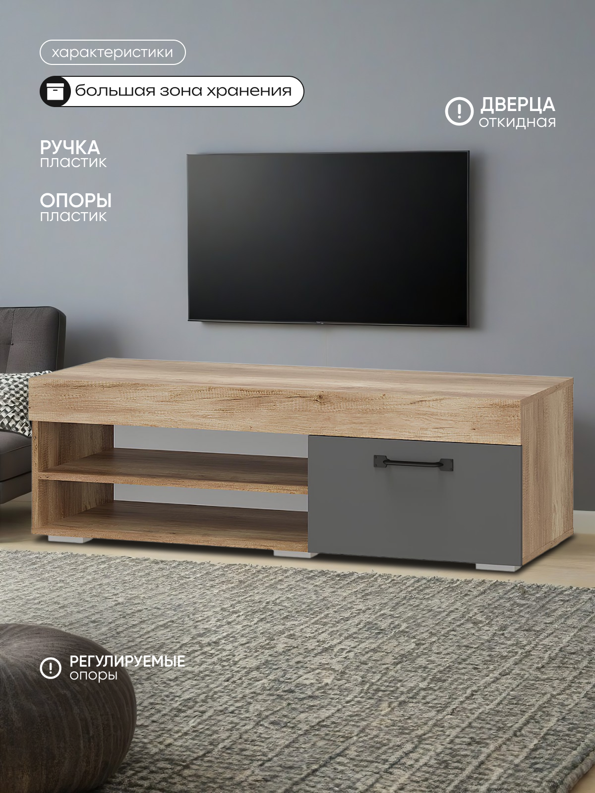 Отзывы на Тумба под ТВ БТС МЕБЕЛЬ "Прима", дуб каньон, графит, 120 x 46 x 120см