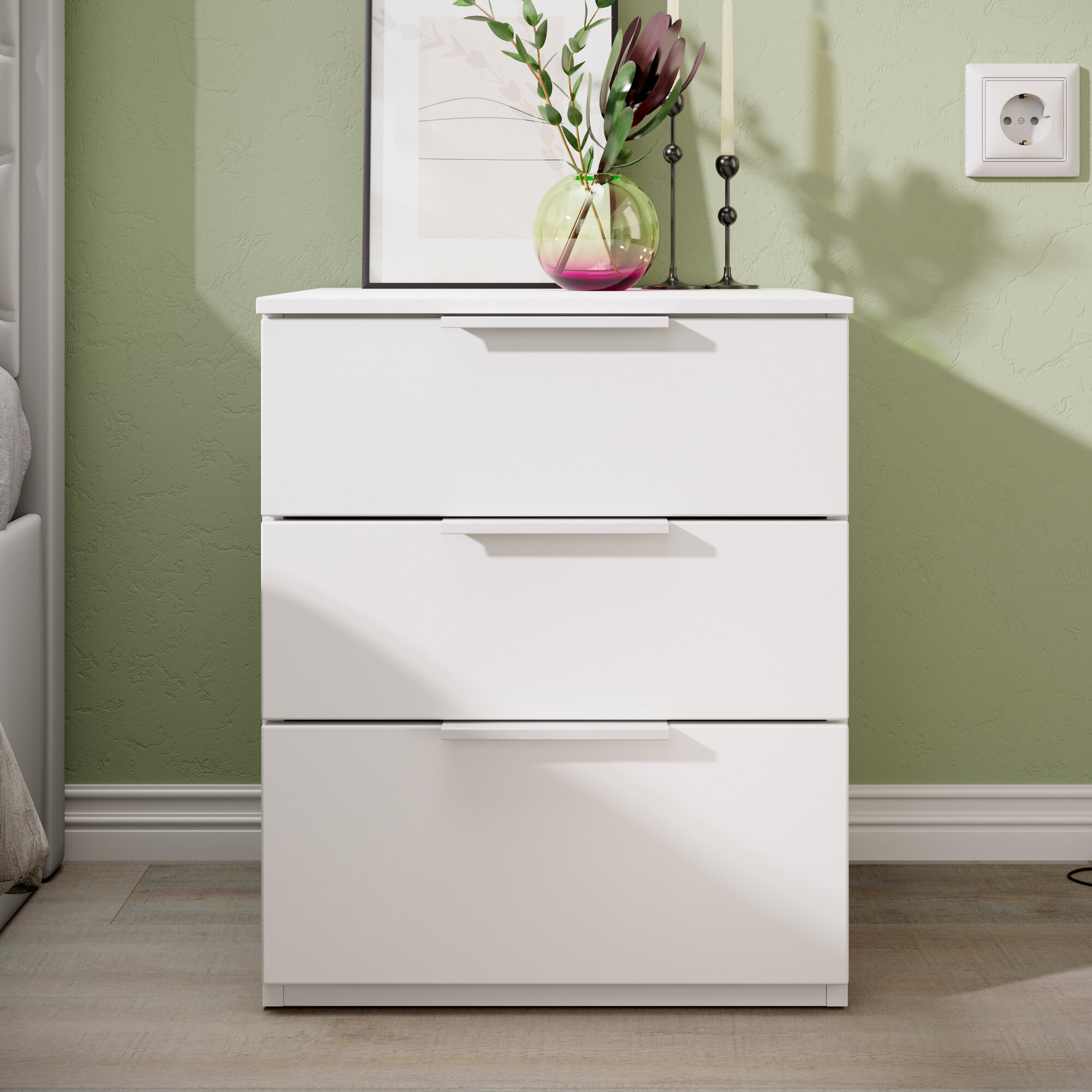 10 цен на Прикроватная тумбочка Мебель Трия "Порто", Белый Жемчуг/Софт, 3 выдвижных ящика