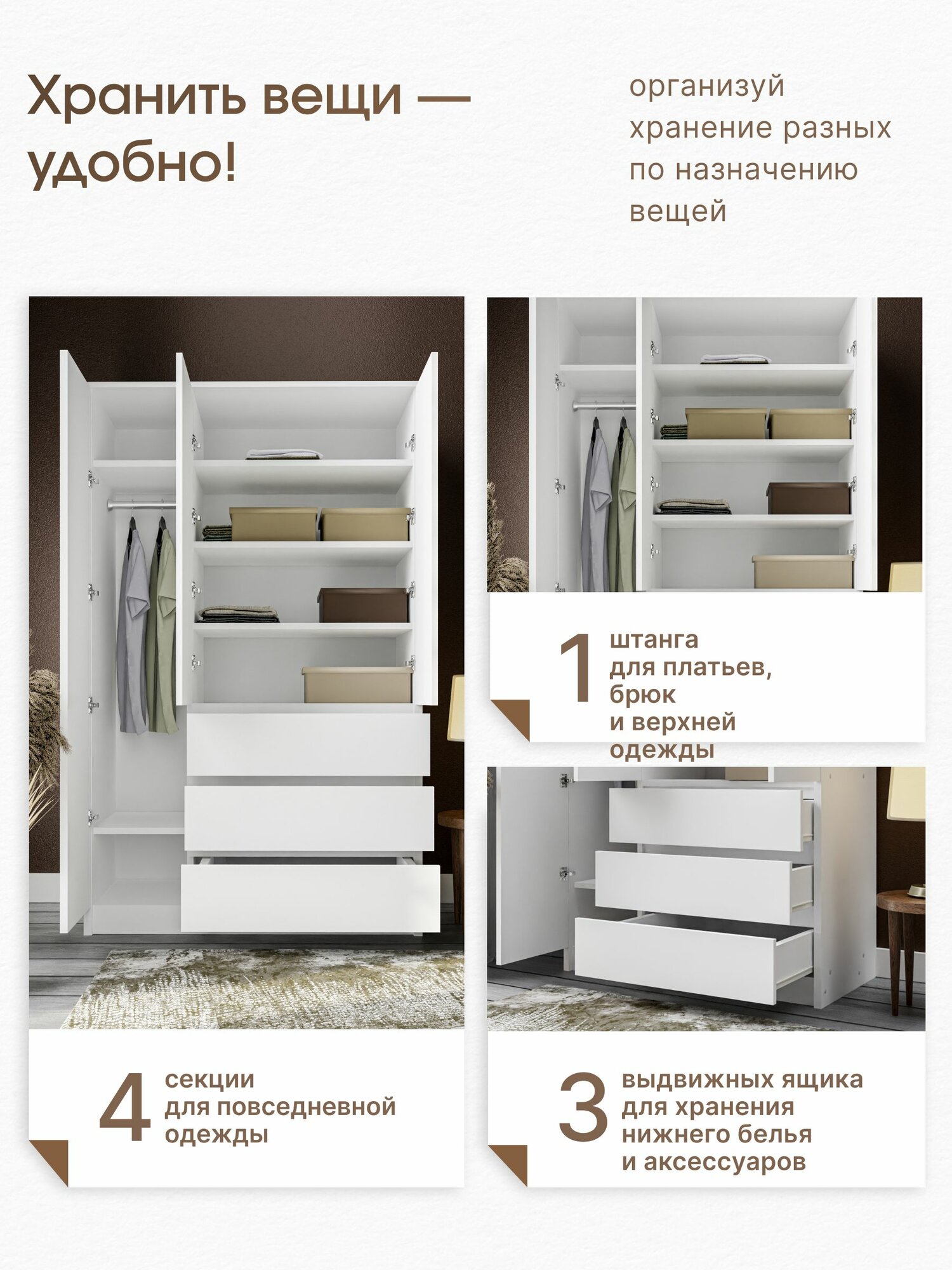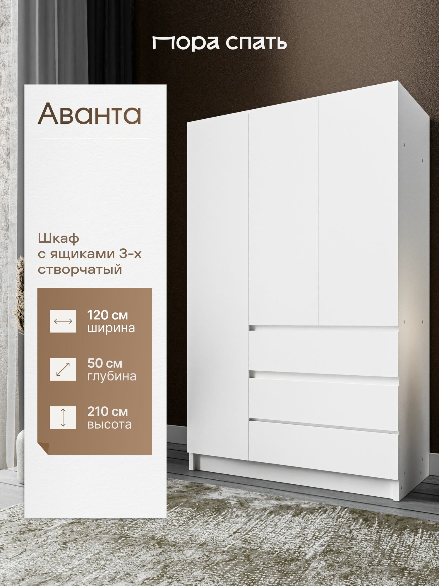 Шкаф распашной 3-х створчатый с ящиками Аванта, 120х50х210 см, белый, Пора Спать информация: