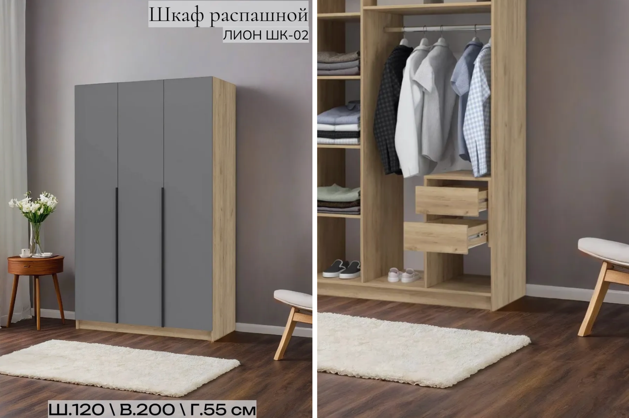 Лион ШК-02 Шкаф 3-х створчатый (1200х2000х550) Дуб крафт/Графит серый информация: