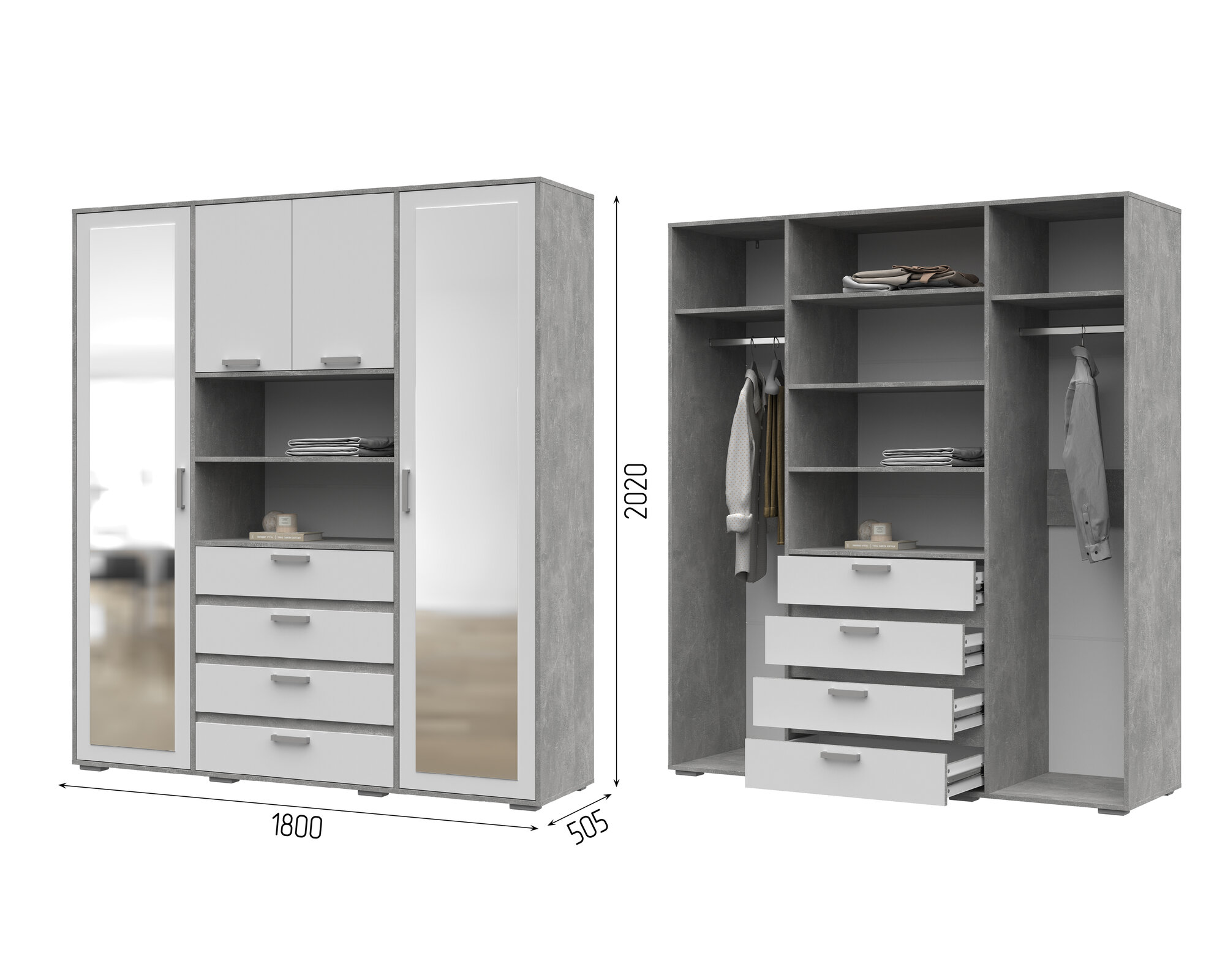 Шкаф с зеркалом Денвер ШК-02 (1800 х2020х504) цвет Ателье светлый/белый Стендмебель информация: