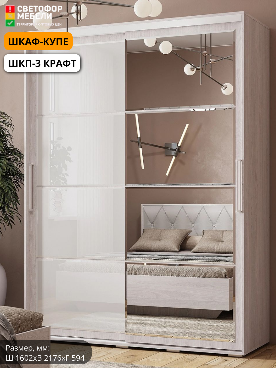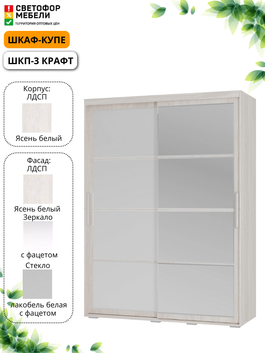 Шкаф-купе Мебельный Рай ШКП-3 Крафт, Ясень белый, раздвижные дверцы со стеклом и зеркалом, 1602х2176х594 информация: