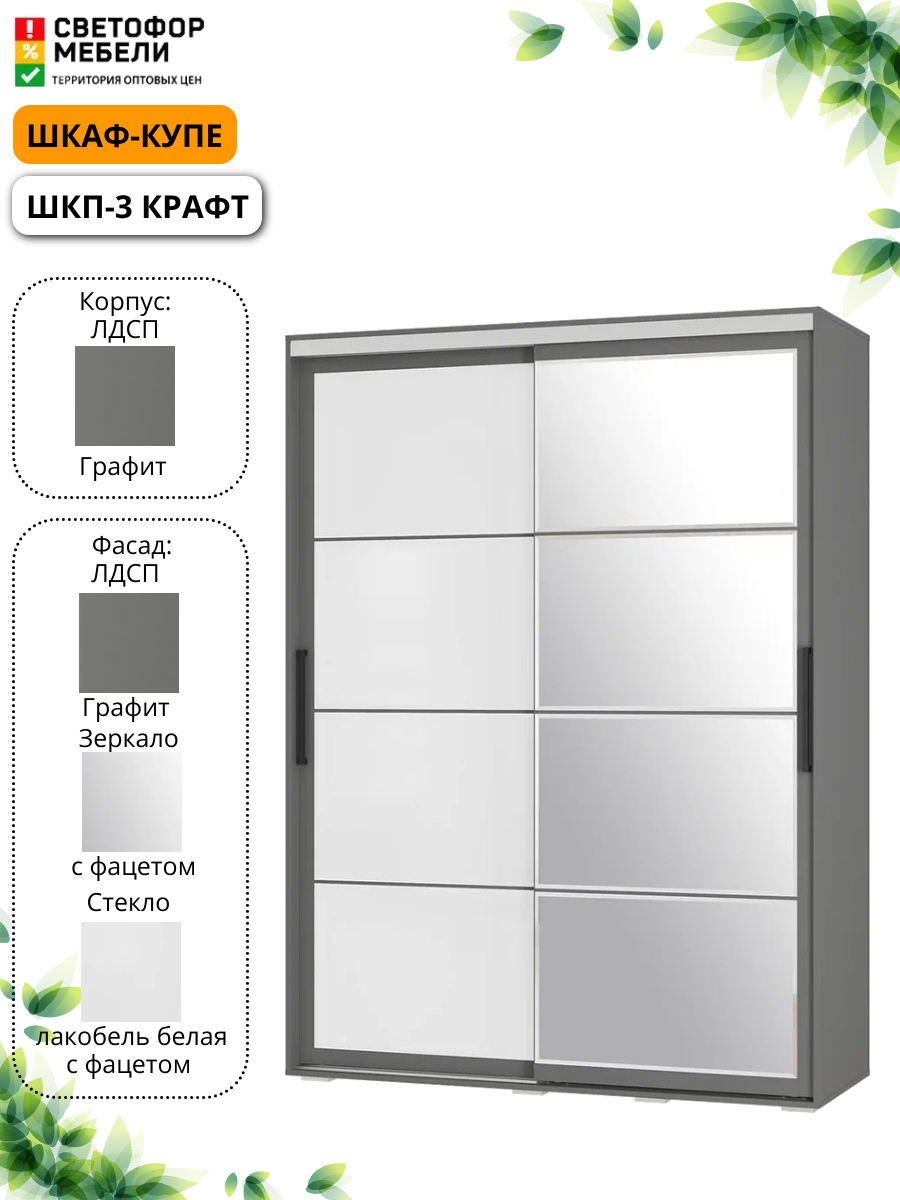 Шкаф-купе Мебельный Рай ШКП-3 Крафт, Графит, раздвижные дверцы со стеклом и зеркалом, графит, 1602х2176х594 информация: