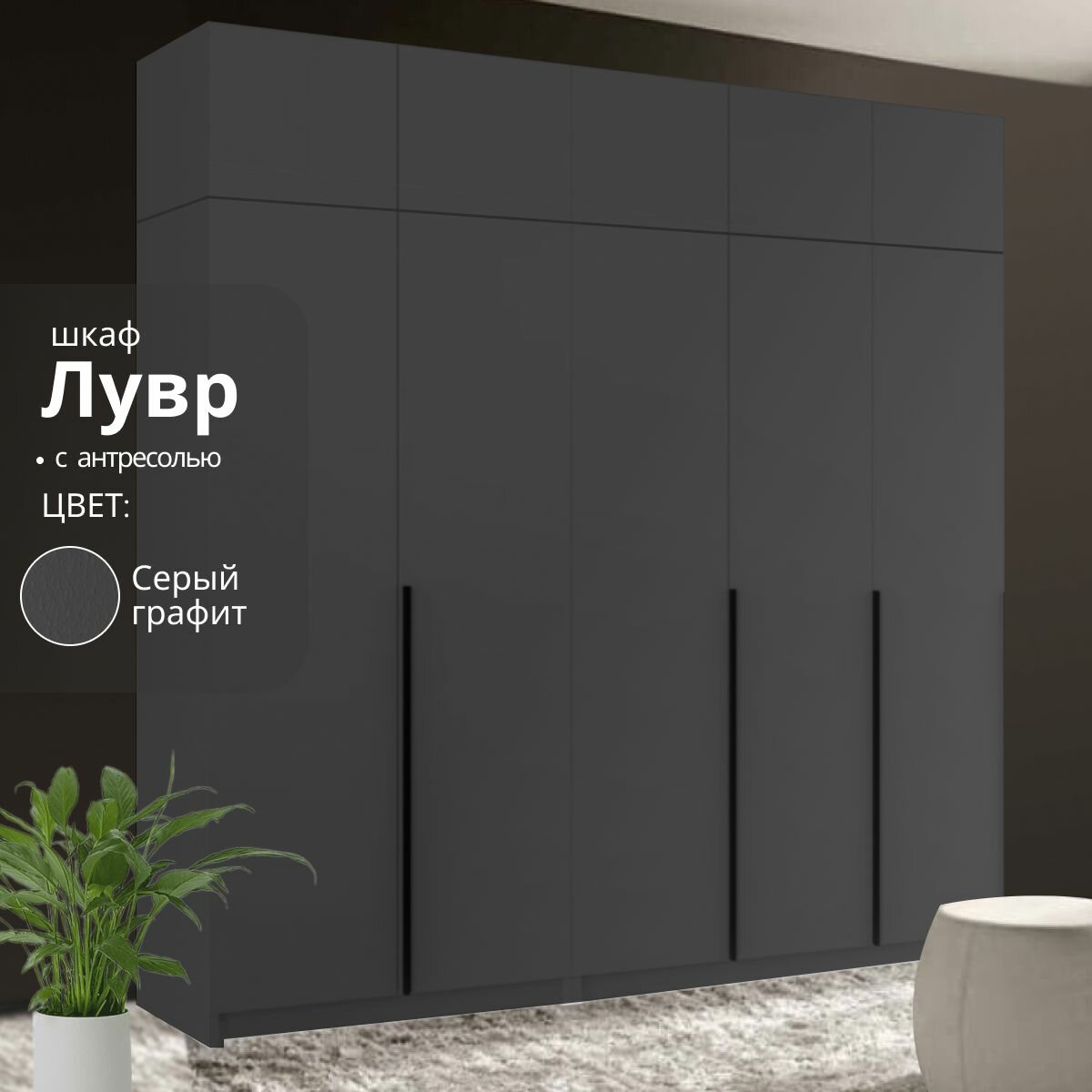 Шкаф распашной для одежды Лувр серый графит, 5-ти дверный, модульный, с доводчиками, полками, штангой и антресолью, 200.2х50.6х260 см информация: