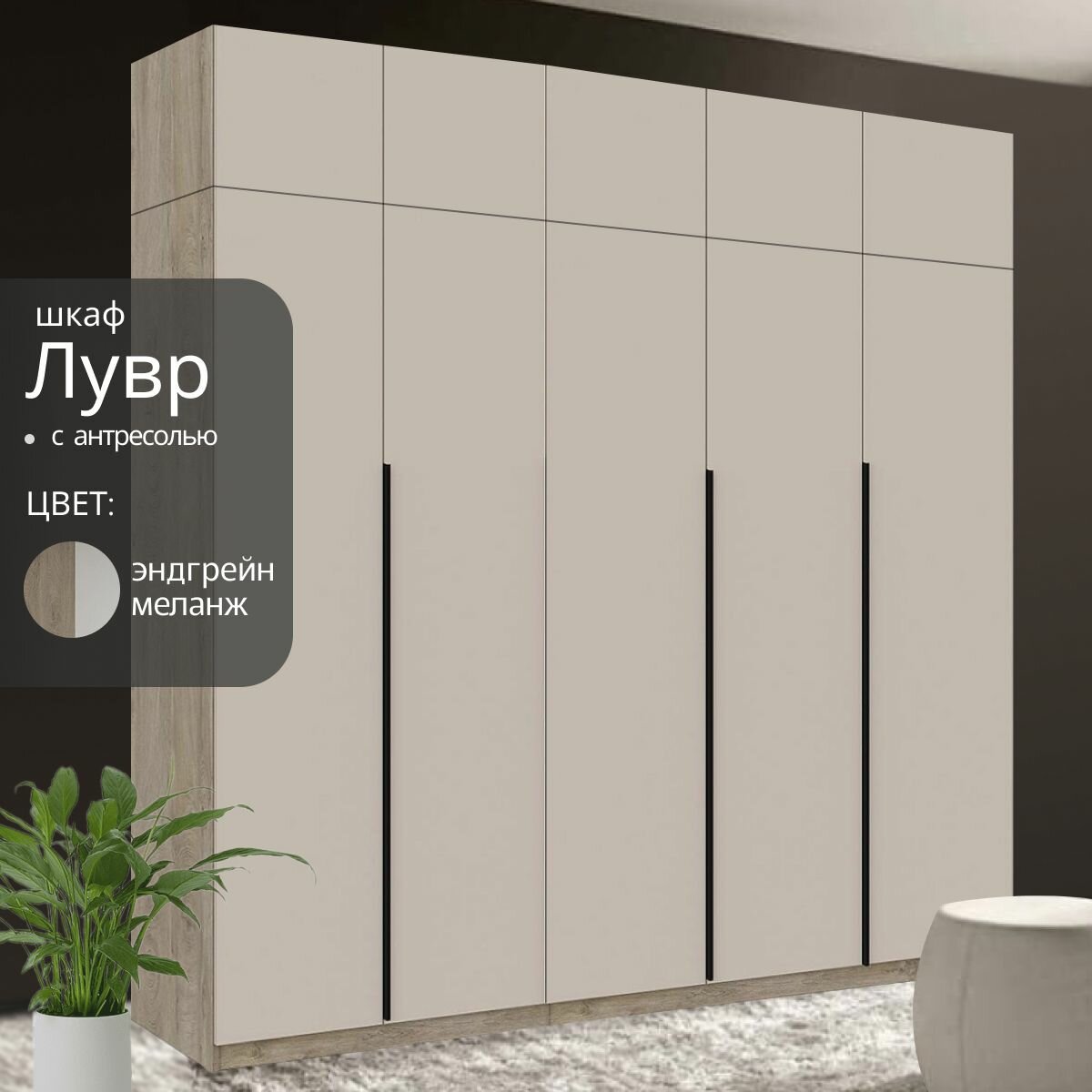 Отзывы на Шкаф распашной для одежды Лувр эндгрейн/меланж(капучино), 5-ти дверный, модульный, с доводчиками, полками, штангой и антресолью 200.2х50.6х260 см