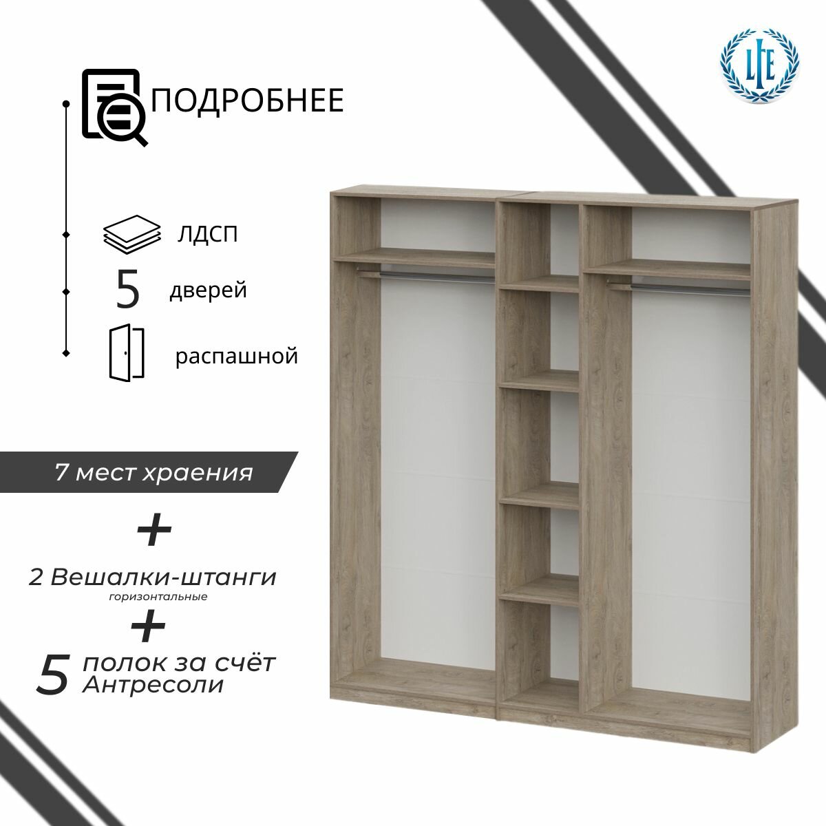 10 цен на Шкаф распашной для одежды Лувр эндгрейн/меланж(капучино), 5-ти дверный, модульный, с доводчиками, полками, штангой и антресолью 200.2х50.6х260 см