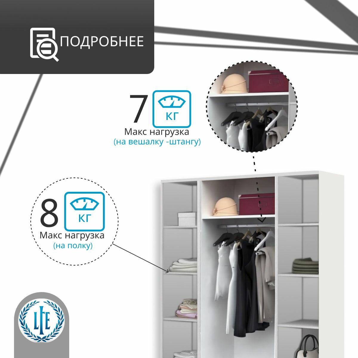 Шкаф для одежды распашной Лувр белый текстурный, 6-ти дверный, модульный, с доводчиками, 7-ю полками и 2-мя штангами, 240.2х50.6х221.6 см 36 367 ₽