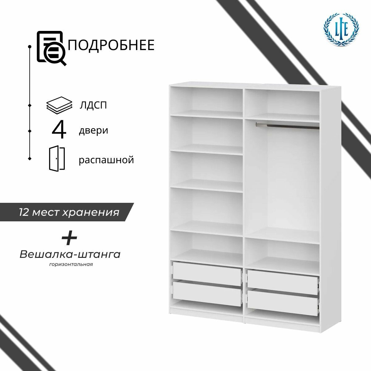 Шкаф распашной для одежды Лувр белый текстурный, 4-х дверный, модульный, с доводчиками, 8-ю полками, 4-мя выдвижными ящиками и штангой, 160.2х50.6х221.6 см информация: