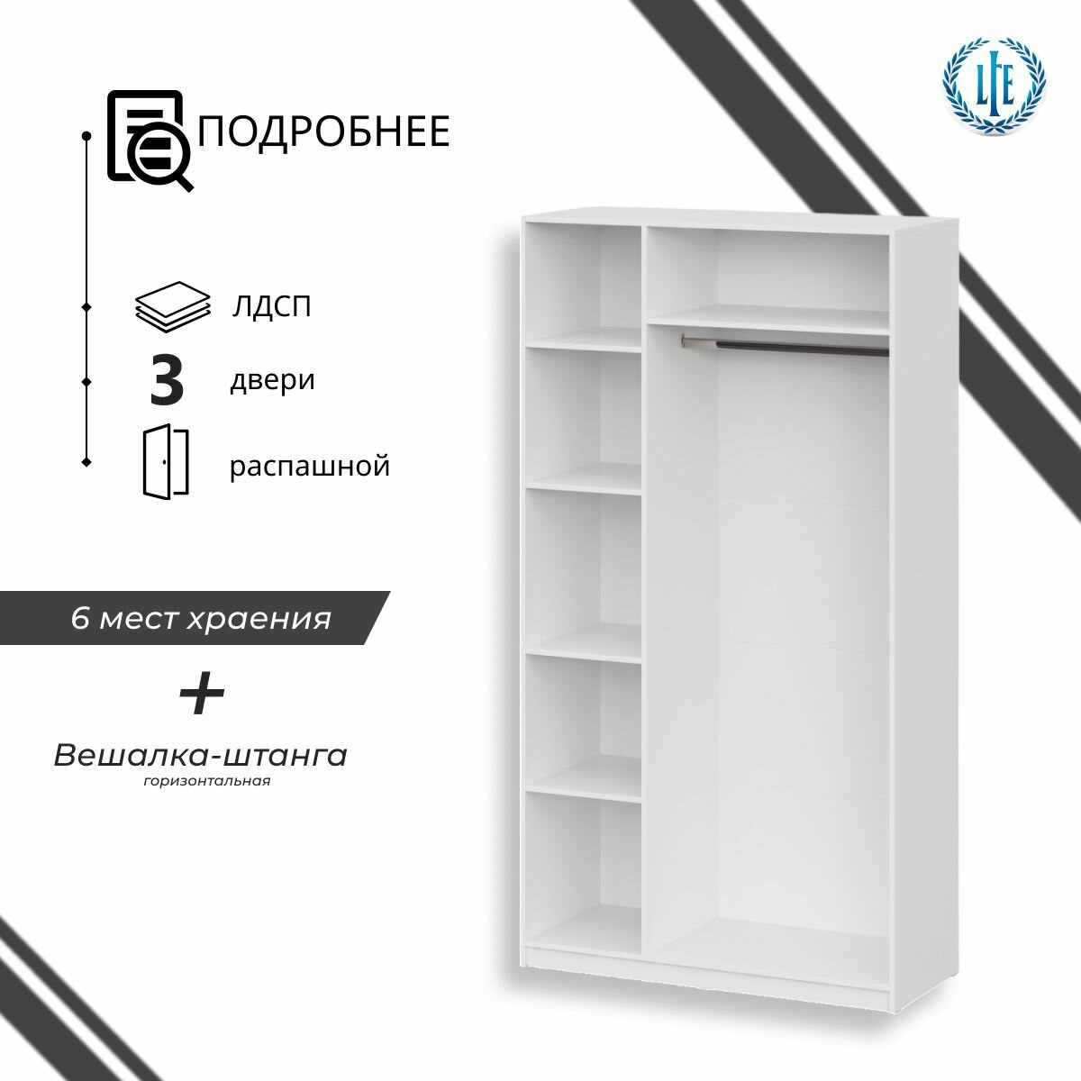 Шкаф распашной для одежды Лувр белый текстурный, 3-х дверный, с доводчиками, полками и штангой, 120.1х50.6х221.6 см 13 951 ₽