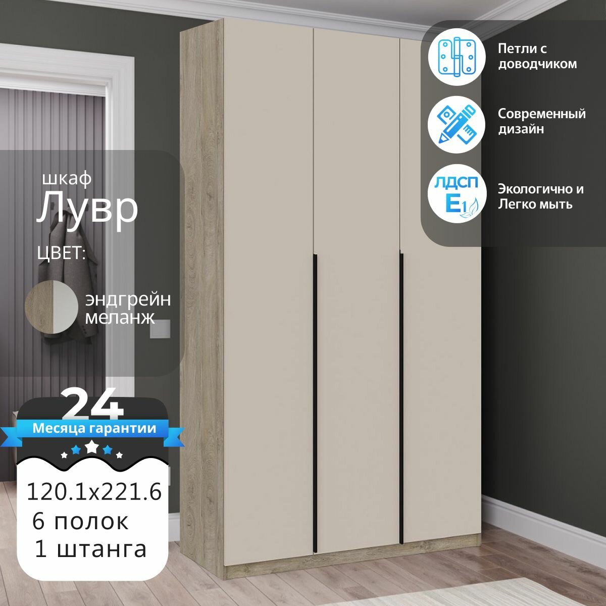 Шкаф распашной для одежды Лувр эндгрейн/меланж(капучино), 3-х дверный, с доводчиками, полками и штангой, 120.1х50.6х221.6 см информация: