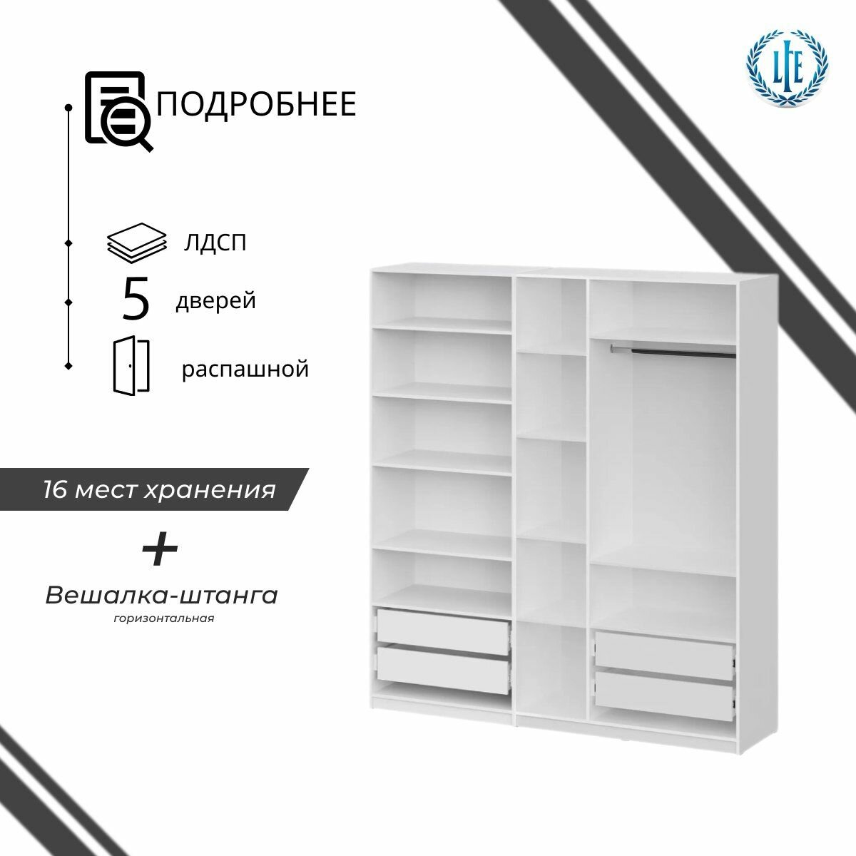 10 цен на Шкаф распашной для одежды Лувр белый/белый глянец, 5-ти дверный, модульный, с доводчиками, 12-ю полками, штангой и 4-мя выдвижными ящиками, 200.2х50.6х221.6 см