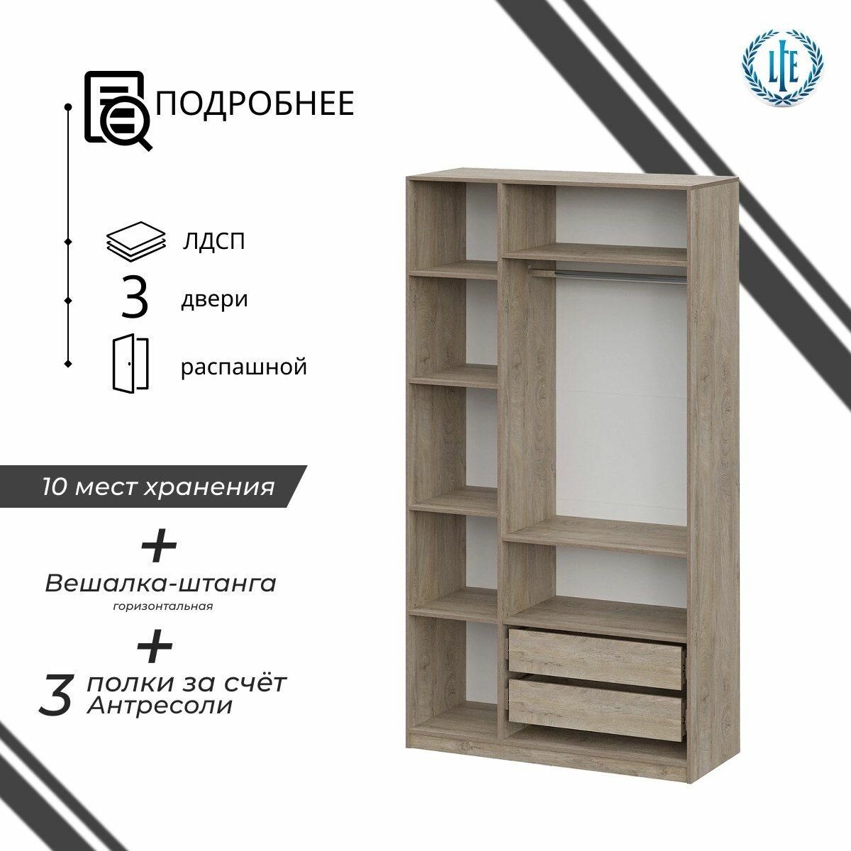 10 цен на Шкаф распашной для одежды Лувр эндгрейн/меланж(капучино), 3-х дверный, модульный, с доводчиками, полками, выдвижными ящиками, штангой и антресолью 120.1х50.6х260 см