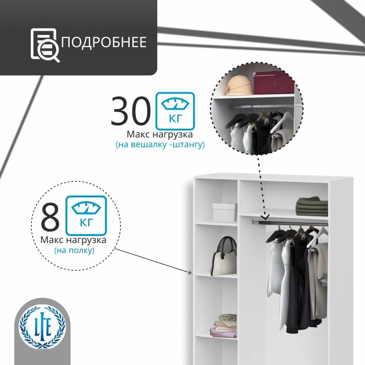 Шкаф для одежды распашной Нонтон Луас, 120 см, 7 полок и штанга, белый глянец