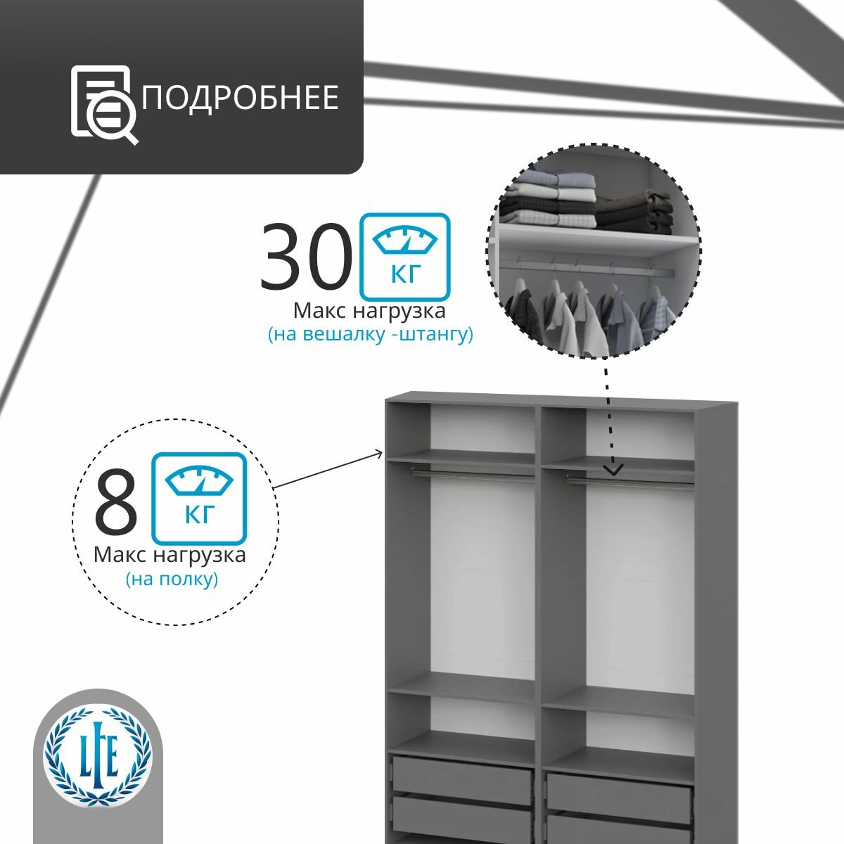 Отзывы на Шкаф распашной для одежды Лувр серый графит, 4-х дверный, модульный, с доводчиками, 4-мя выдвижными ящиками и 2 штангами, 160.2х50.6х221.6 см