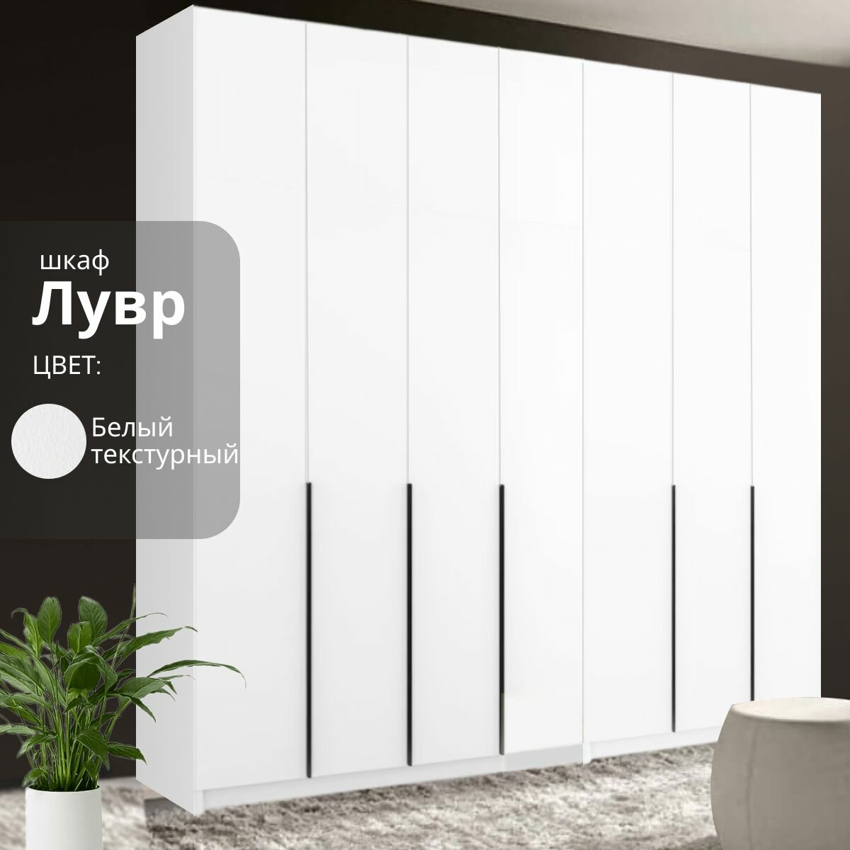 Шкаф распашной для одежды Лувр белый текстурный, 7-ми дверный, модульный, с доводчиками, полками и штангой, 280.3х50.6х221.6 см информация: