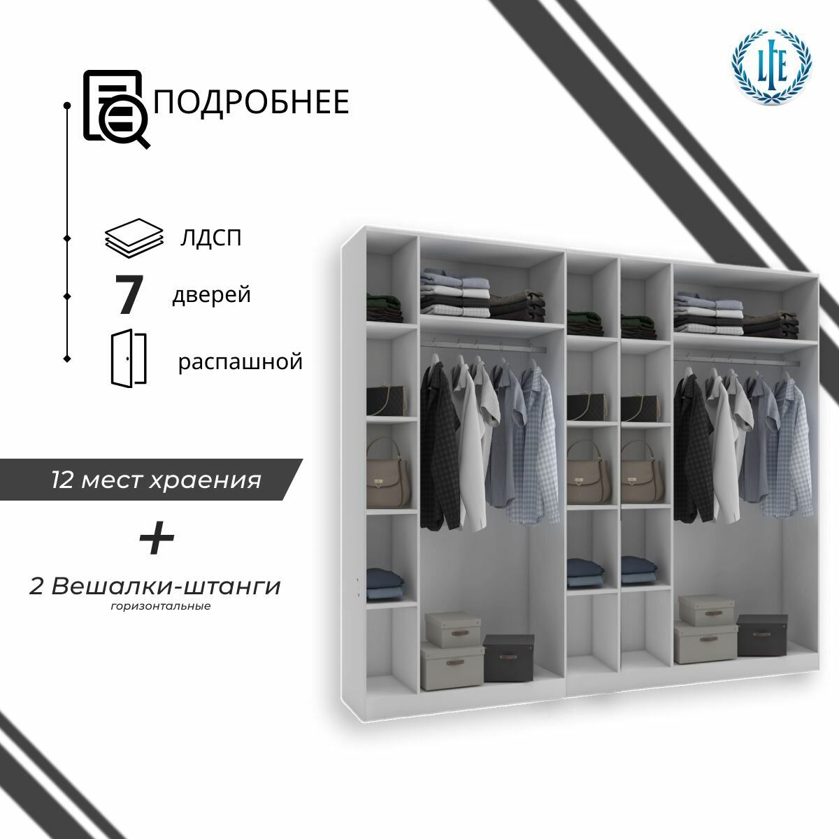 10 цен на Шкаф распашной для одежды Лувр белый текстурный, 7-ми дверный, модульный, с доводчиками, полками и штангой, 280.3х50.6х221.6 см