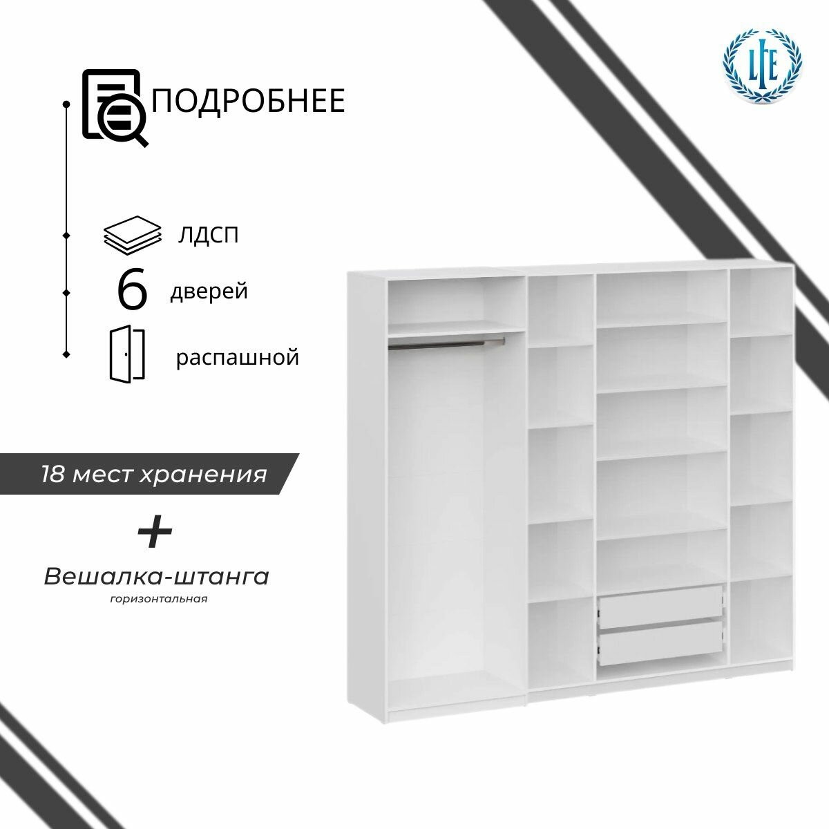 10 цен на Шкаф распашной для одежды Лувр белый/белый глянец, 6-ти дверный, модульный, с доводчиками, 14-ю полками, штангой, 2-мя выдвижными ящиками и антресолью, 240.2х50.6х260 см