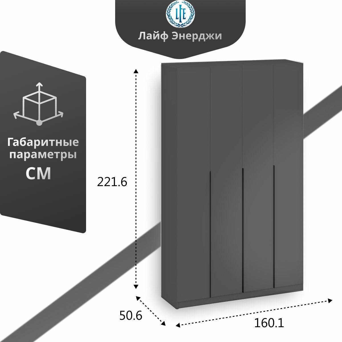 Шкаф распашной для одежды Лувр серый графит, 4-х дверный, с доводчиками, 13-ю полками и выдвижными ящиками, 160.1х50.6х221.6 см информация: