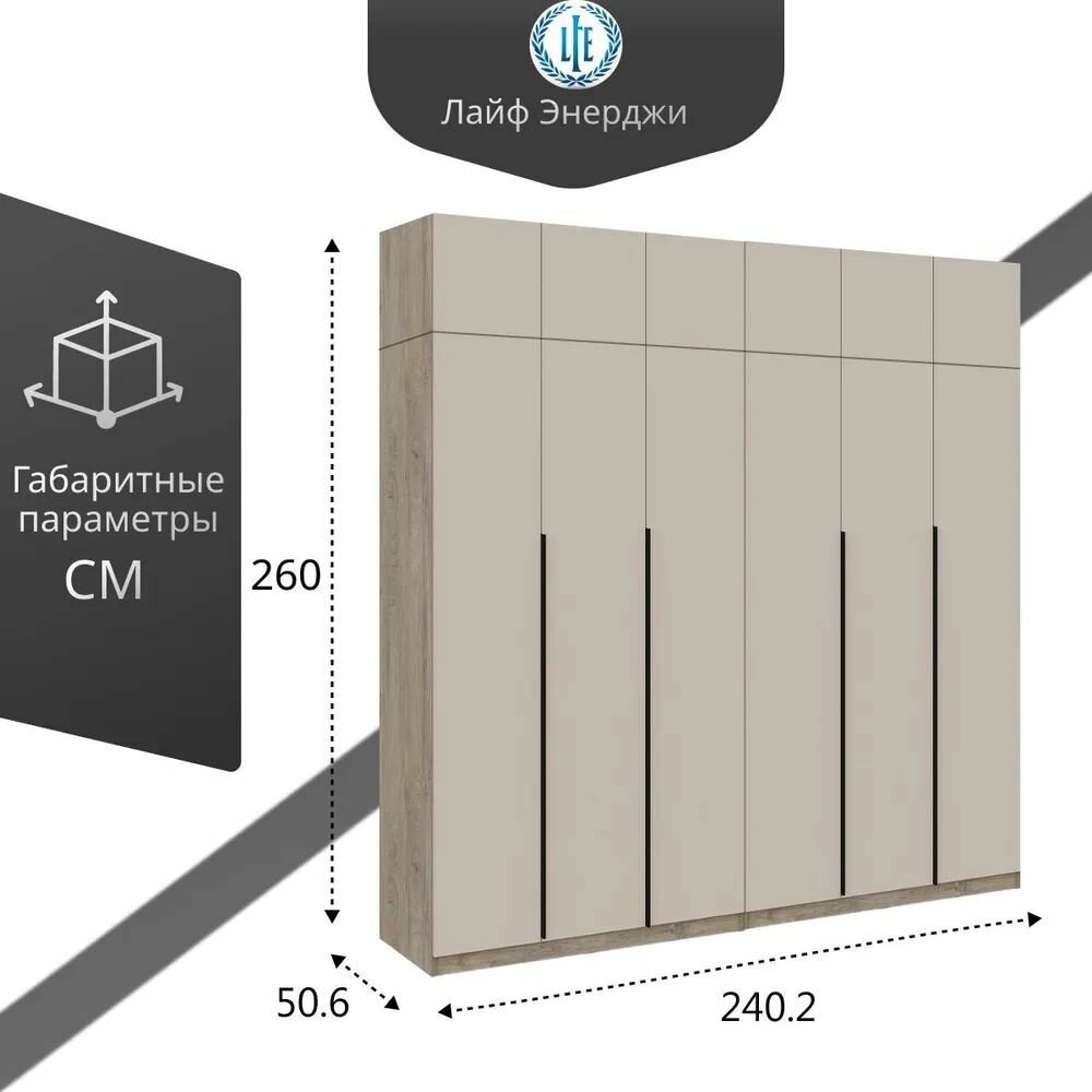 Шкаф для одежды распашной Лувр эндгрейн/меланж(капучино), 6-ти дверный, модульный, с доводчиками, 12-ю полками и 3-мя штангами, 240.2х50.6х260 см 47 123 ₽