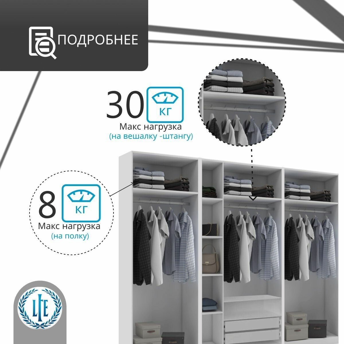 Шкаф распашной Лувр белый текстурный, 8-ми дверный, модульный, с доводчиками, 20-ю полками, выдвижными ящиками и 2 штангами, 320.2х50.6х221.6 см 44 589 ₽