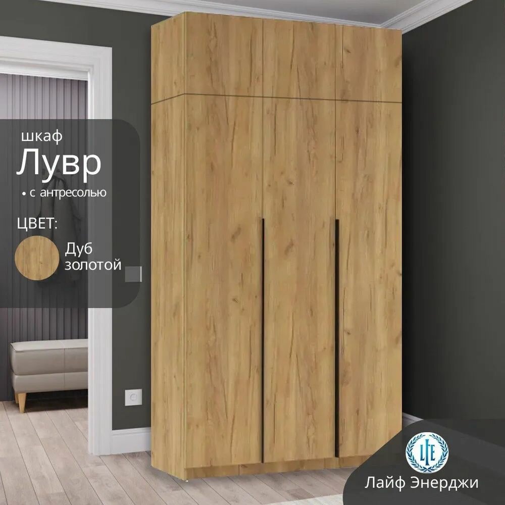 Отзывы на Шкаф распашной для одежды Лувр дуб золотой, 3-х дверный , с доводчиками, 9-ю полками, выдвижными ящиками и антресолью, 120.1х50.6х260 см