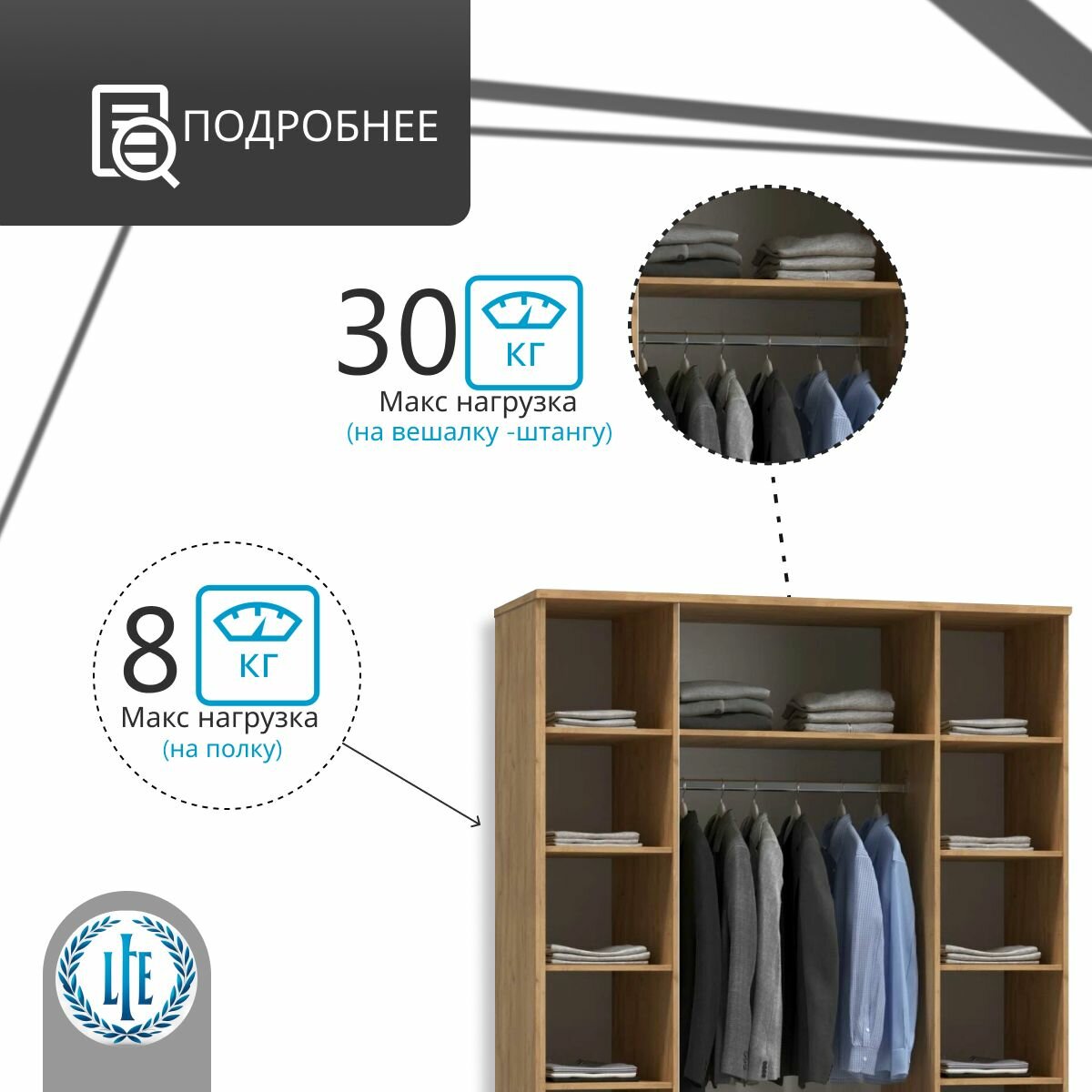 Шкаф для одежды распашной Лувр дуб золотой, 6-ти дверный, модульный, с доводчиками, 9-ю полками и 3-мя штангами, 240.2х50.6х221.6 см 37 750 ₽