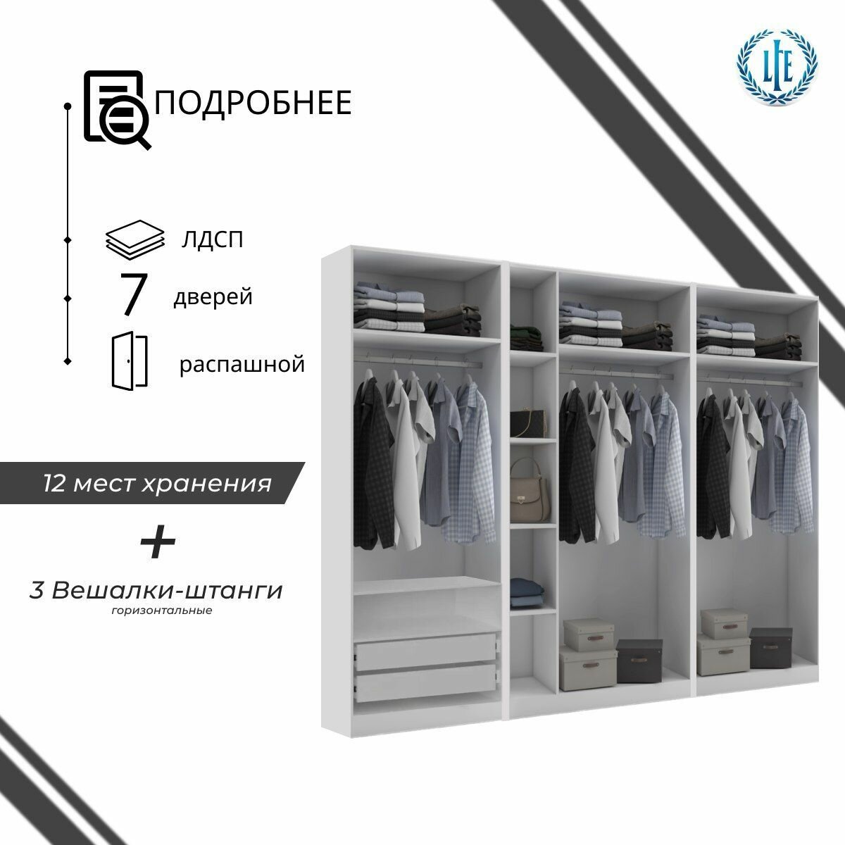 10 цен на Шкаф для одежды распашной Лувр белый/белый глянец, 7-ми дверный, модульный, с доводчиками, выдвижными ящиками, 9-ю полками и 3-мя штангами, 280.2х50.6х221.6 см