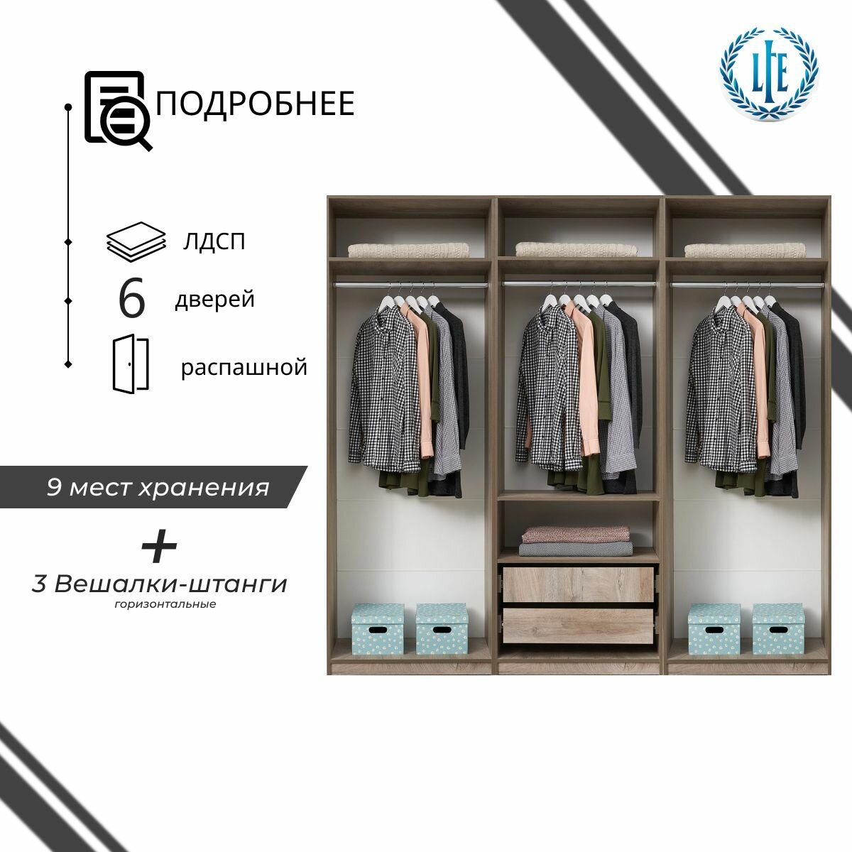 10 цен на Шкаф для одежды распашной Лувр эндгрейн/меланж(капучино), 6-ти дверный, модульный, с доводчиками, 2-мя ящиками, 5-ю полками и 3-мя штангами, 240.2х50.6х221.6 см