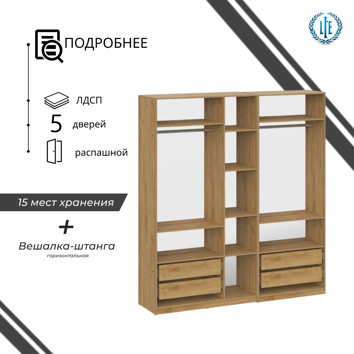 10 цен на Шкаф распашной Лувр дуб золотой, 5-ти дверный, модульный, с доводчиками, 10-ю полками, 2 штангами, 4-мя выдвижными ящиками, 200.2х50.6х221.6 см