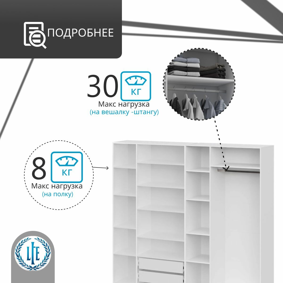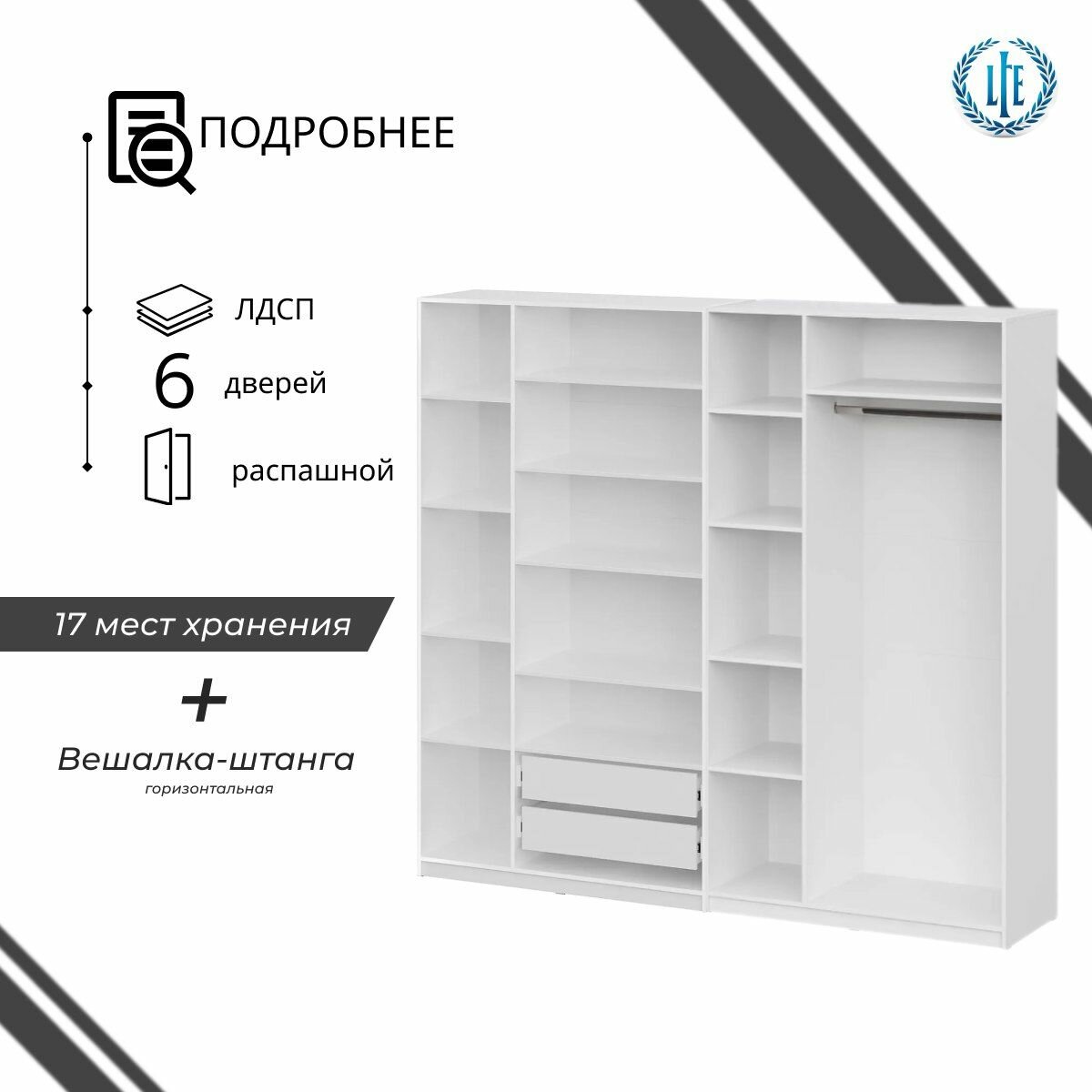 10 цен на Шкаф распашной для одежды Лувр белый/белый глянец, 6-ти дверный, модульный, с доводчиками, 14-ю полками и выдвижными ящиками, 240.2х50.6х221.6 см