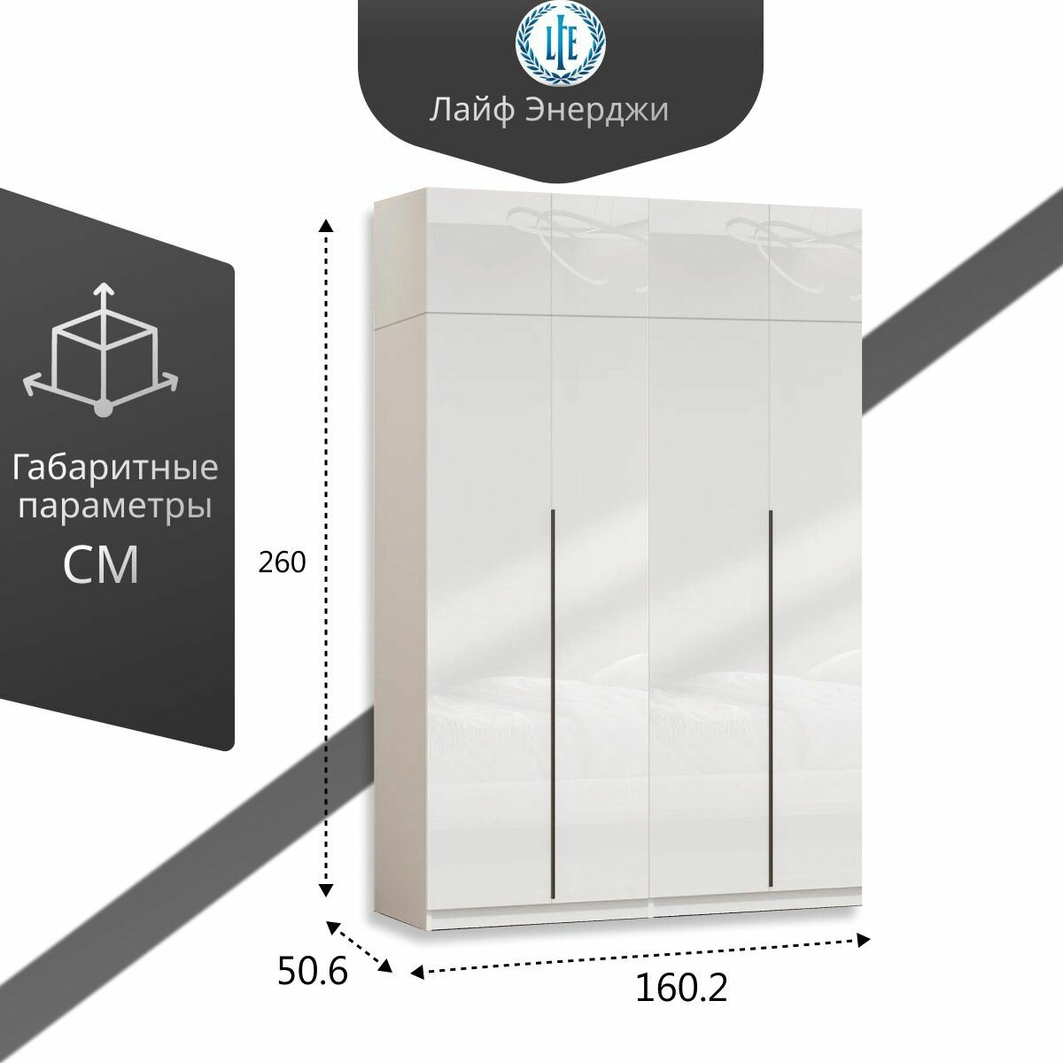 Шкаф распашной для одежды Лувр белый/белый глянец, 4-х дверный, с доводчиками, полками, штангой и антресолью 160.1х50.6х260 см 28 857 ₽