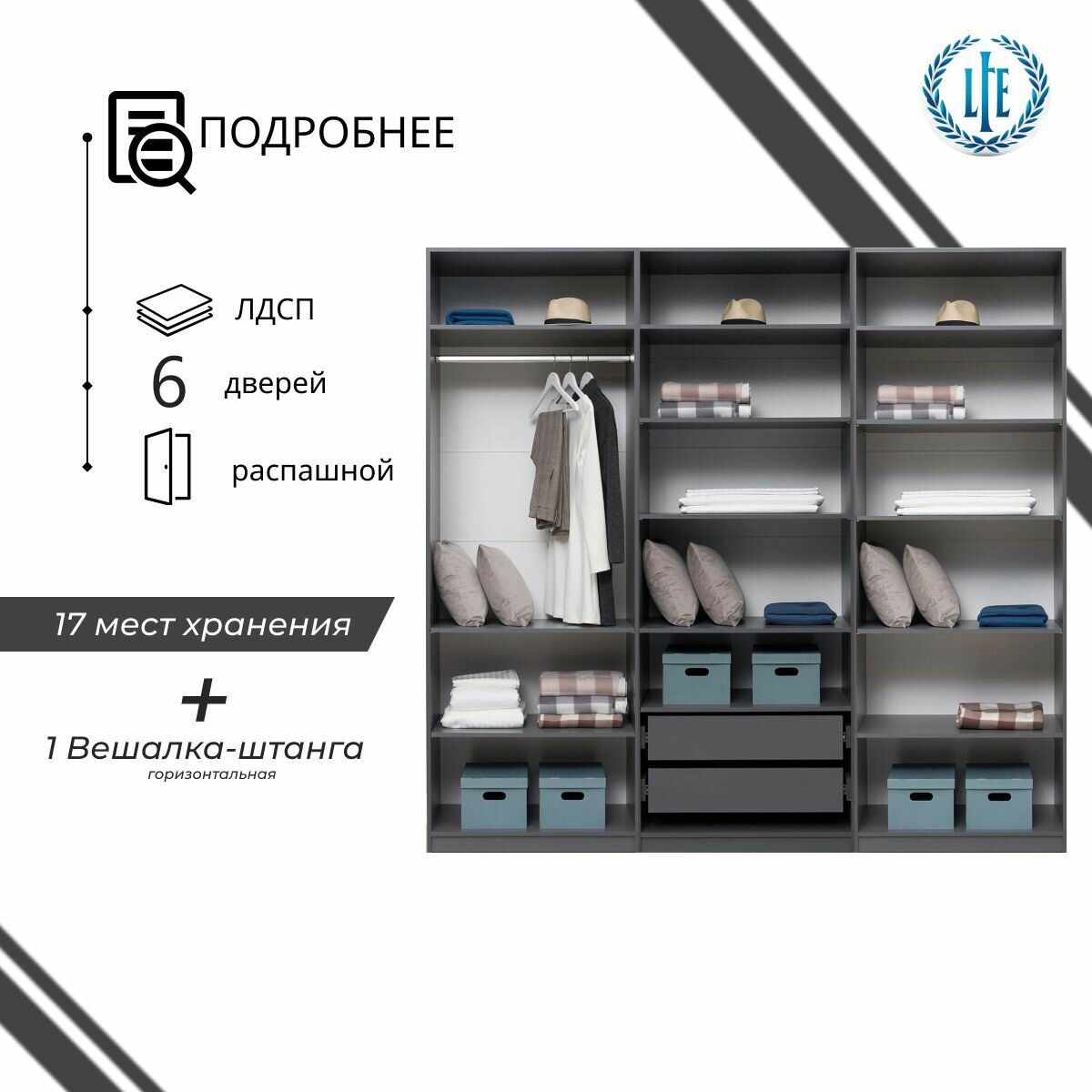10 цен на Шкаф для одежды распашной Лувр графит серый, 6-ти дверный, модульный, с доводчиками, 2-мя ящиками, 13-ю полками и штангой, 240.2х50.6х221.6 см