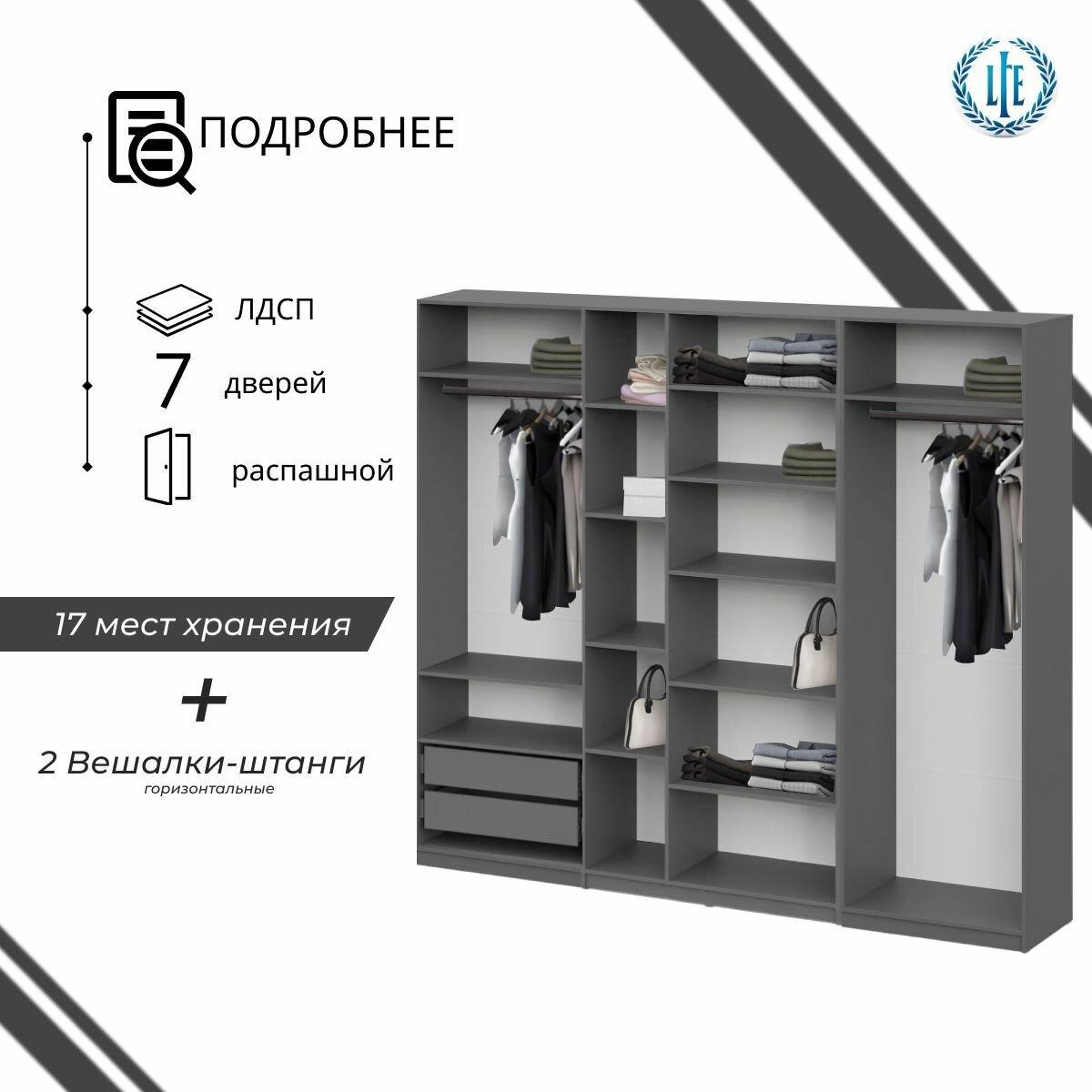 Шкаф для одежды распашной Лувр серый графит, 7-ми дверный, модульный, с доводчиками, выдвижными ящиками, 13-ю полками и 2-мя штангами, 280.3х50.6х221.6 см информация: